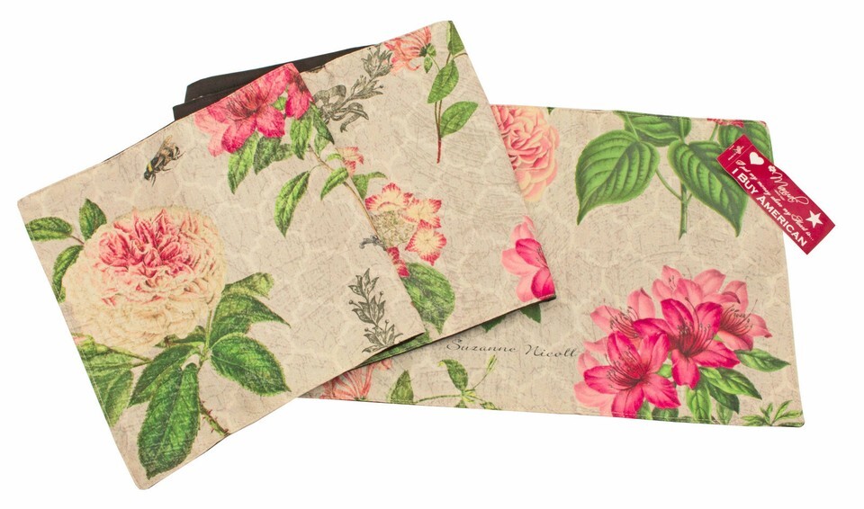 Suzann Nicoll has designed another beautiful table runner through her use of rich color and modern whimsy. Against a silvery gray design background and beautiful pink roses, day lilies and hydrangeas to name a few, with dark and lighter green leaves. Colorful black and yellow bumble bees fly among the flowers. The table runner also has a bumble bee within a darker gray partial wreath topped off with a crown. This table runner is lined in black fabric -100% polyester. It is an elegant looking made in America table runner. Which will add beauty and sophistication to your dining room table, sideboard, sofa table or dresser. It will also help to protect those surfaces.