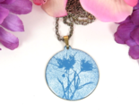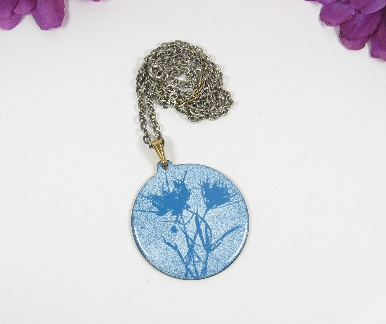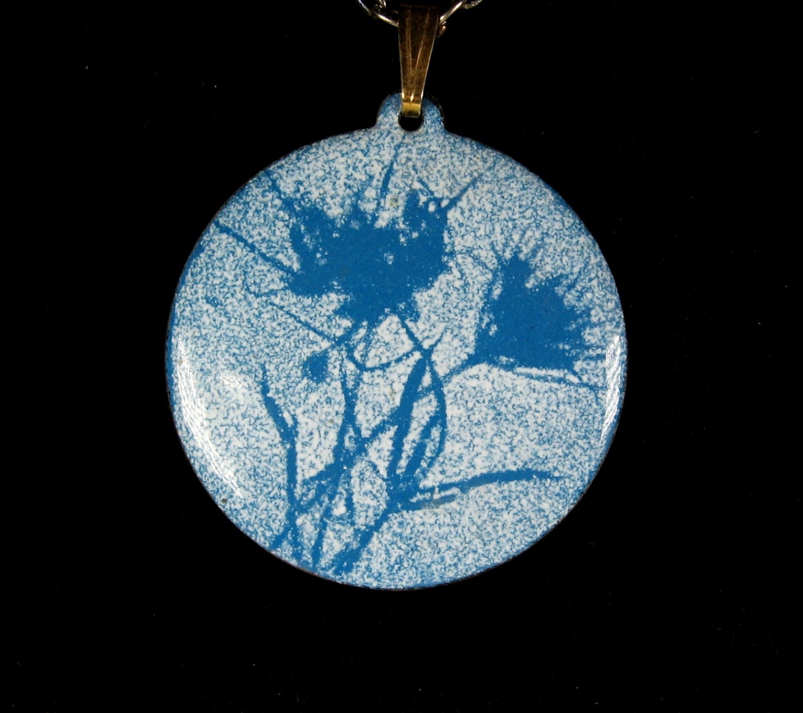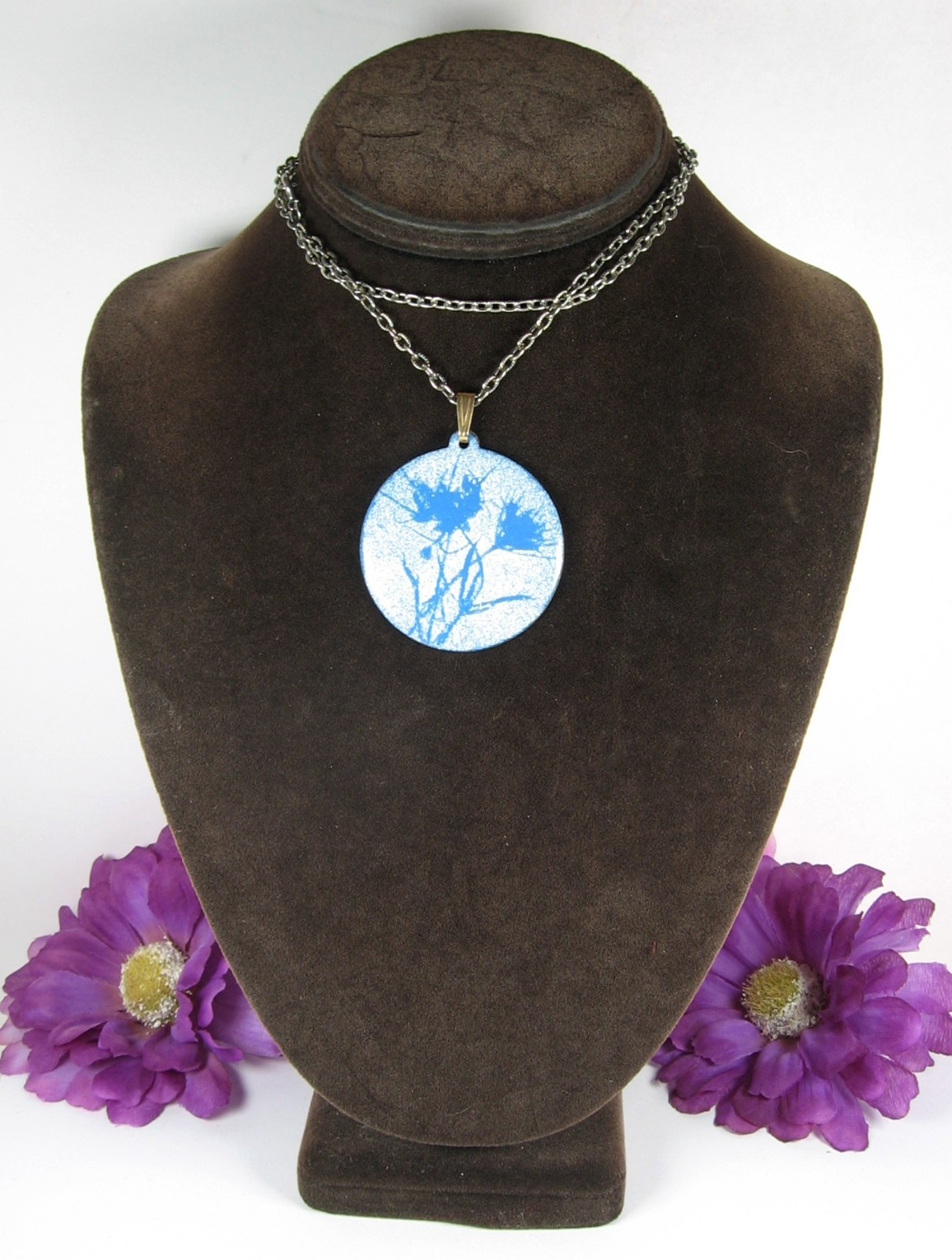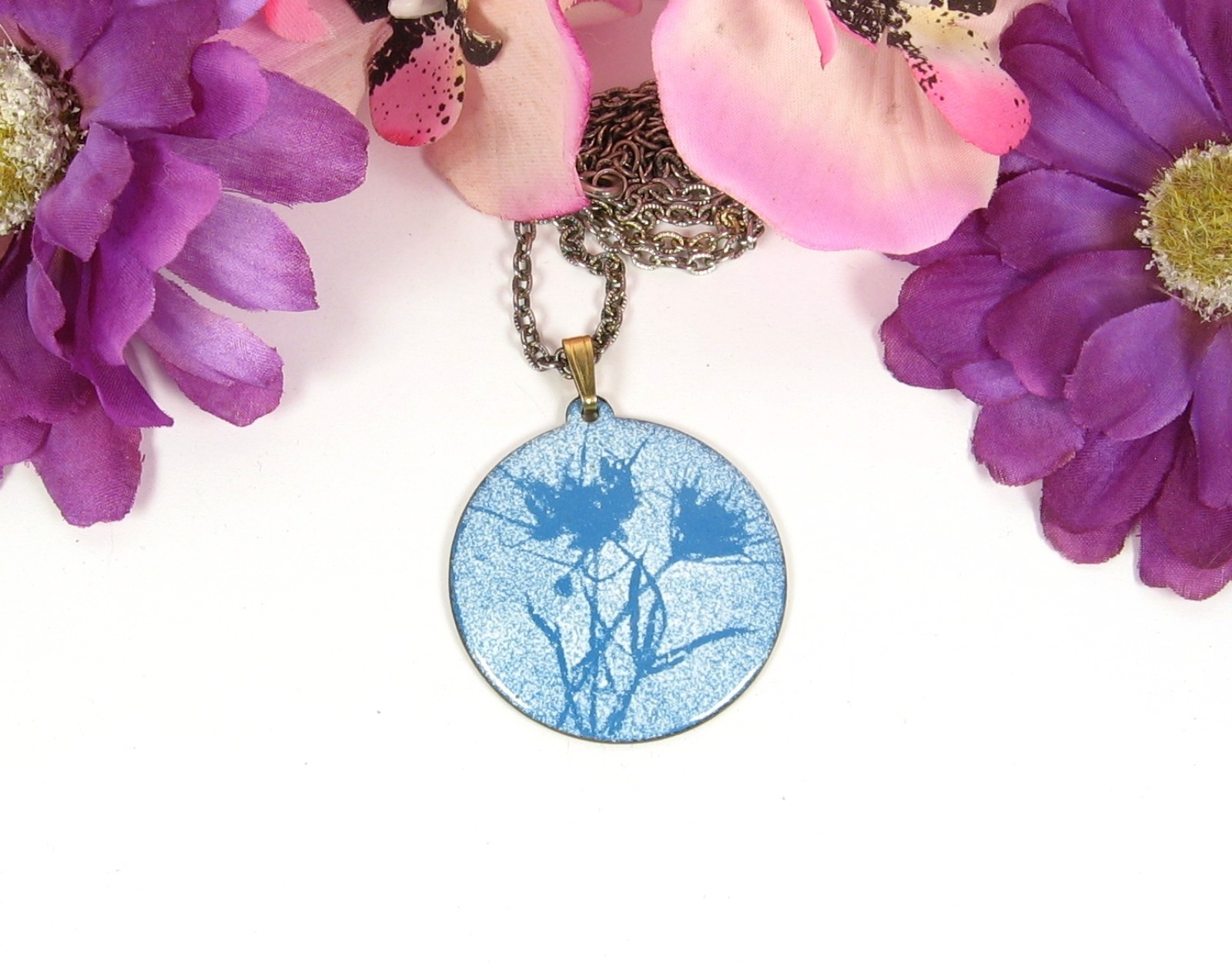 Handcrafted Enamel Over Copper Pendant Necklace ? Botanical Silhouette in Deep Sky Blue