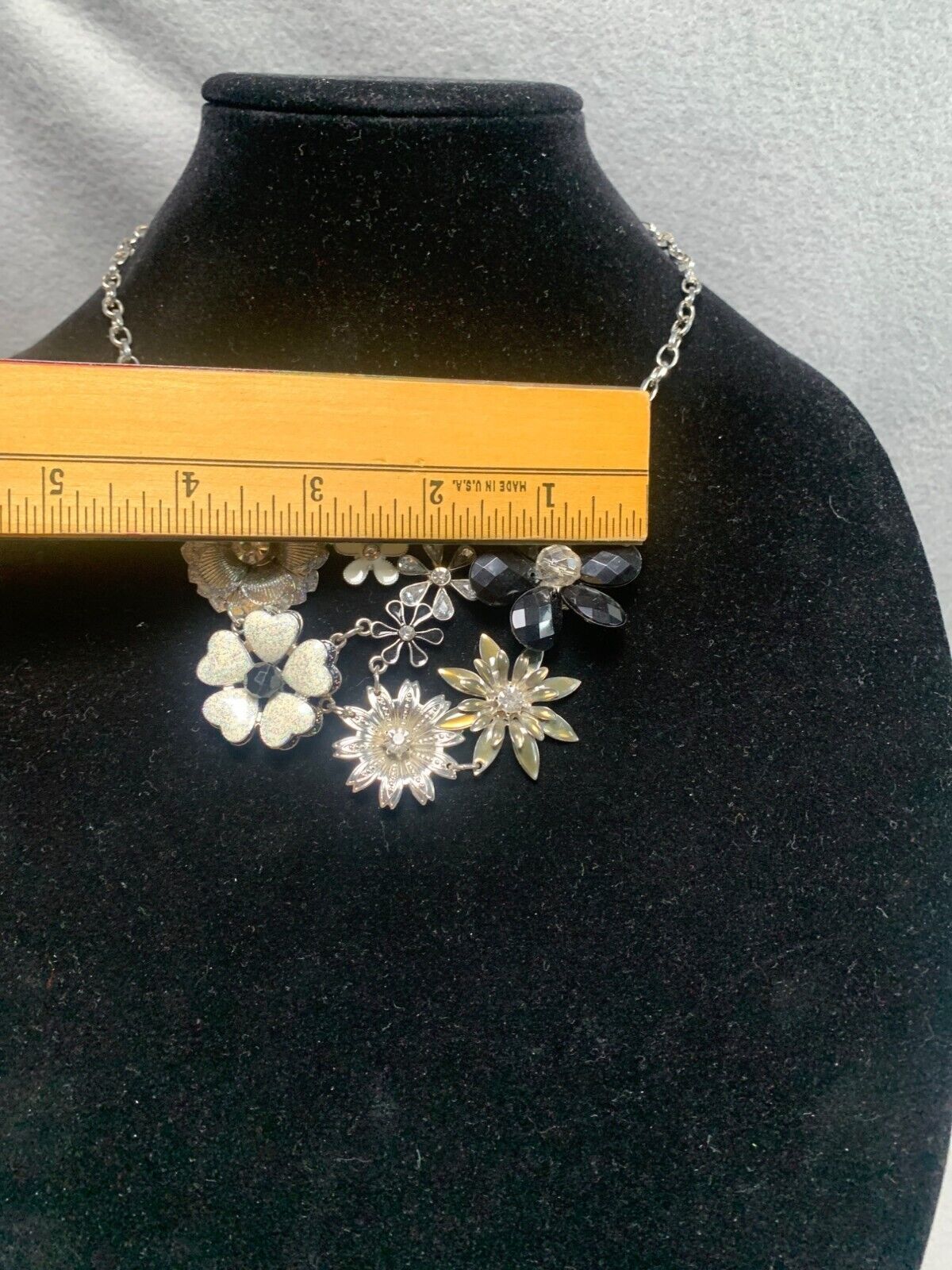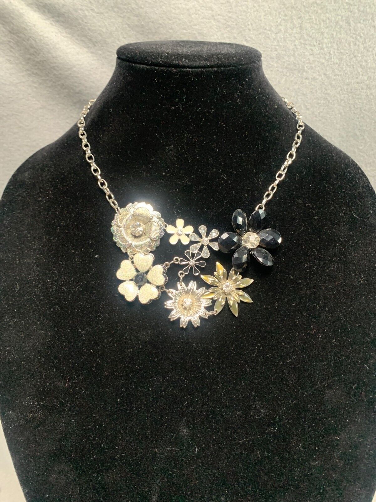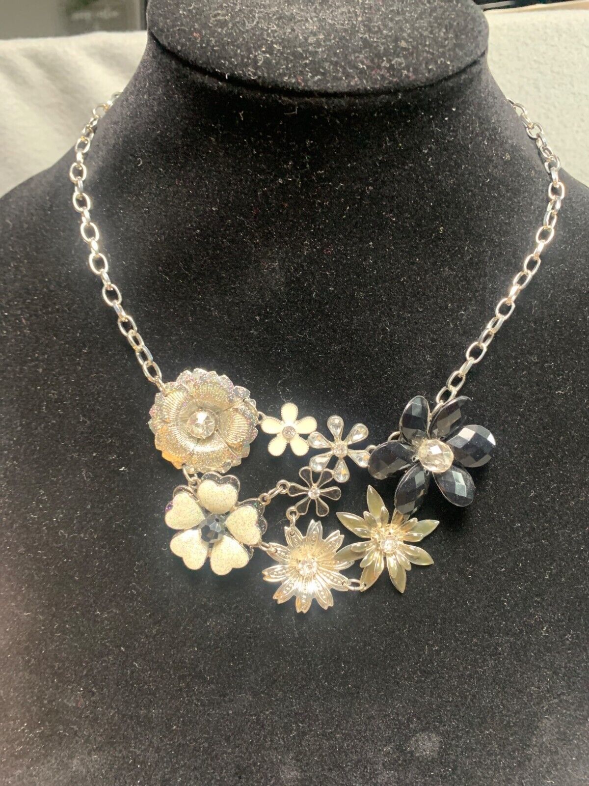 This elegant floral statement necklace features a blend of mixed metal and crystal accents, creating a versatile piece suitable for various professional settings.