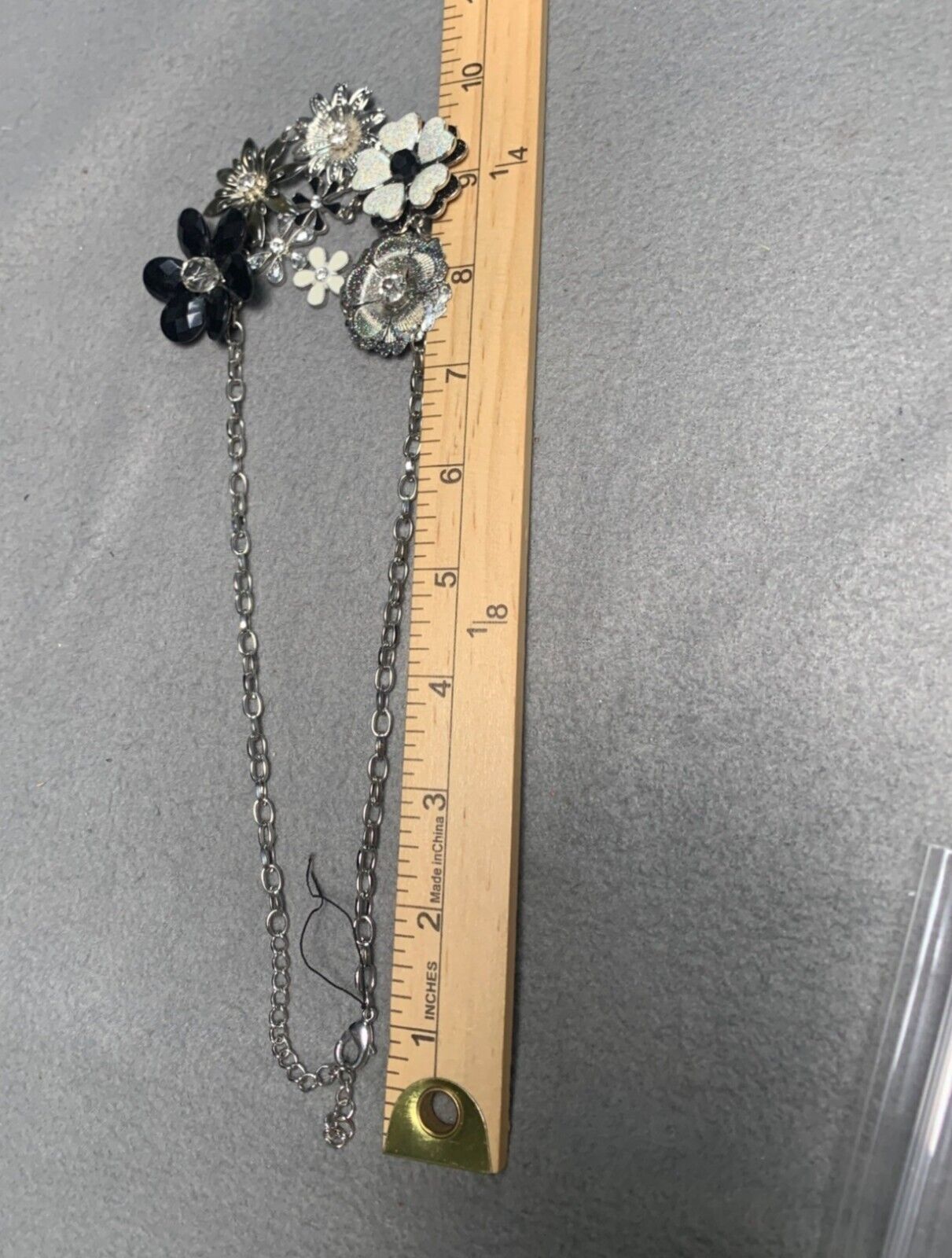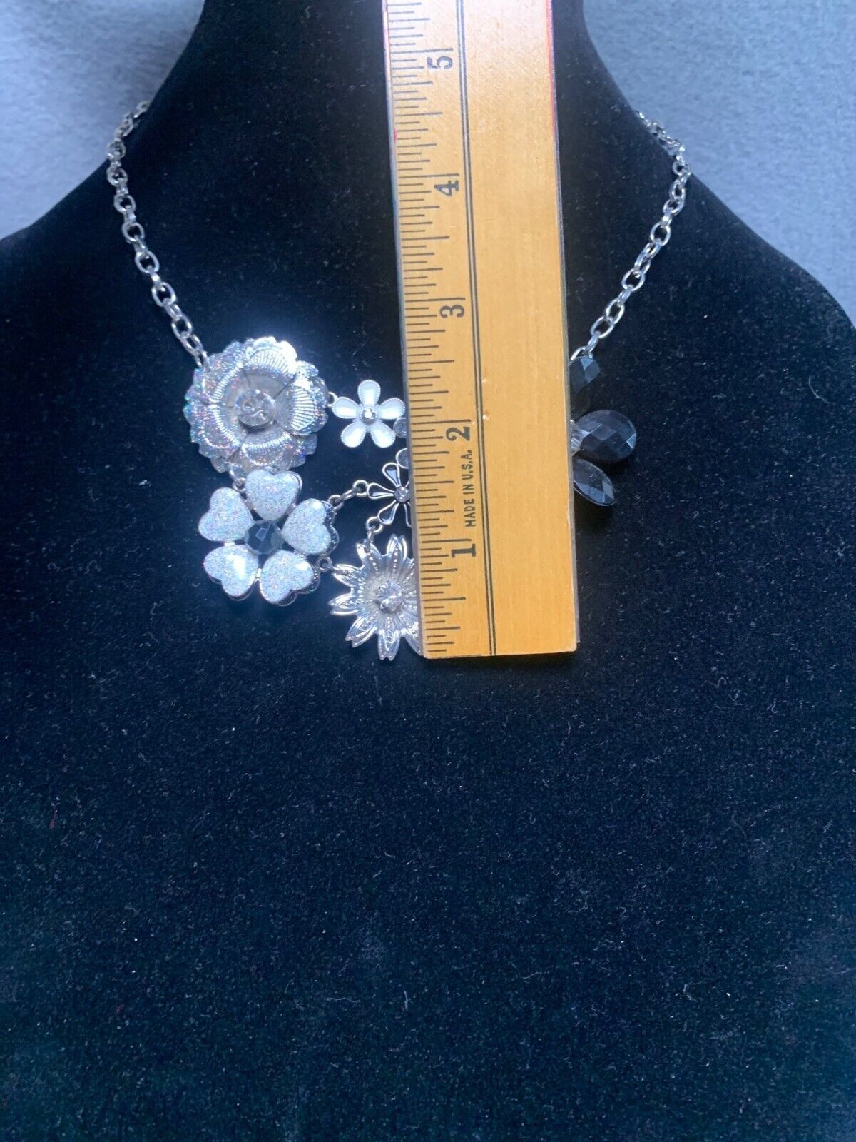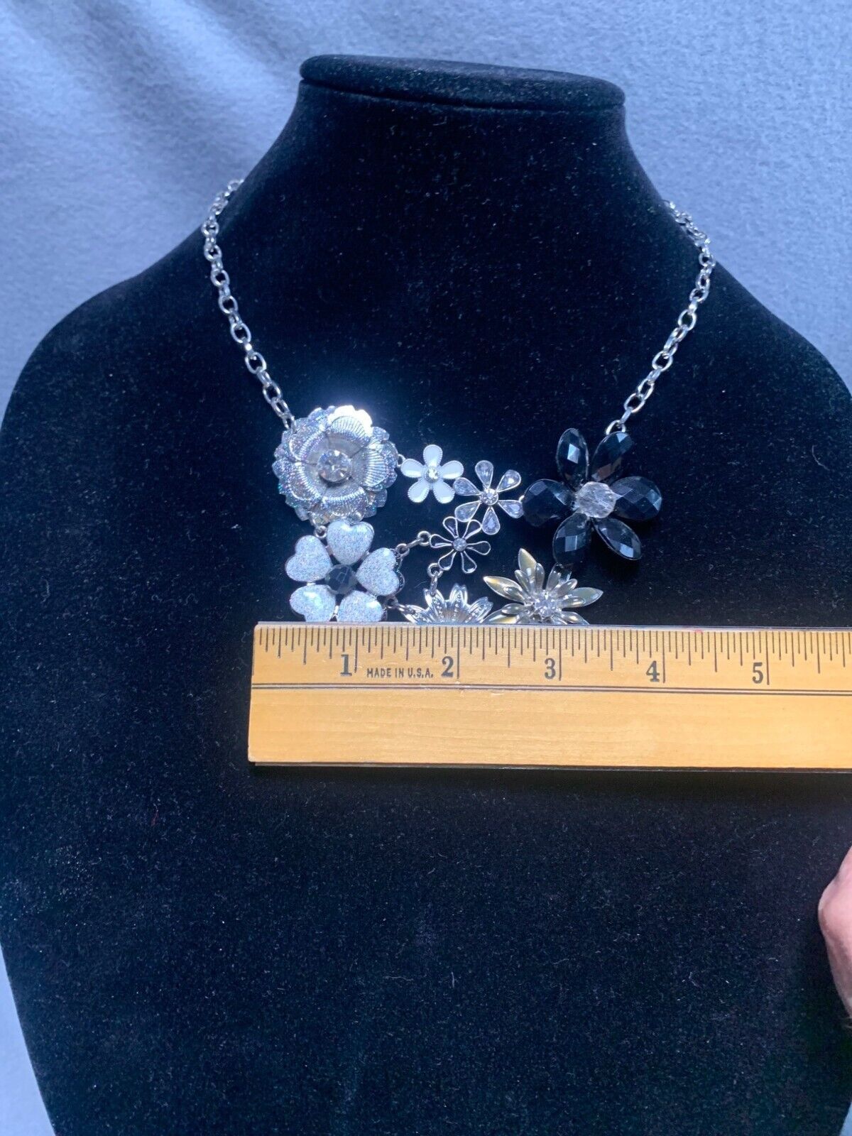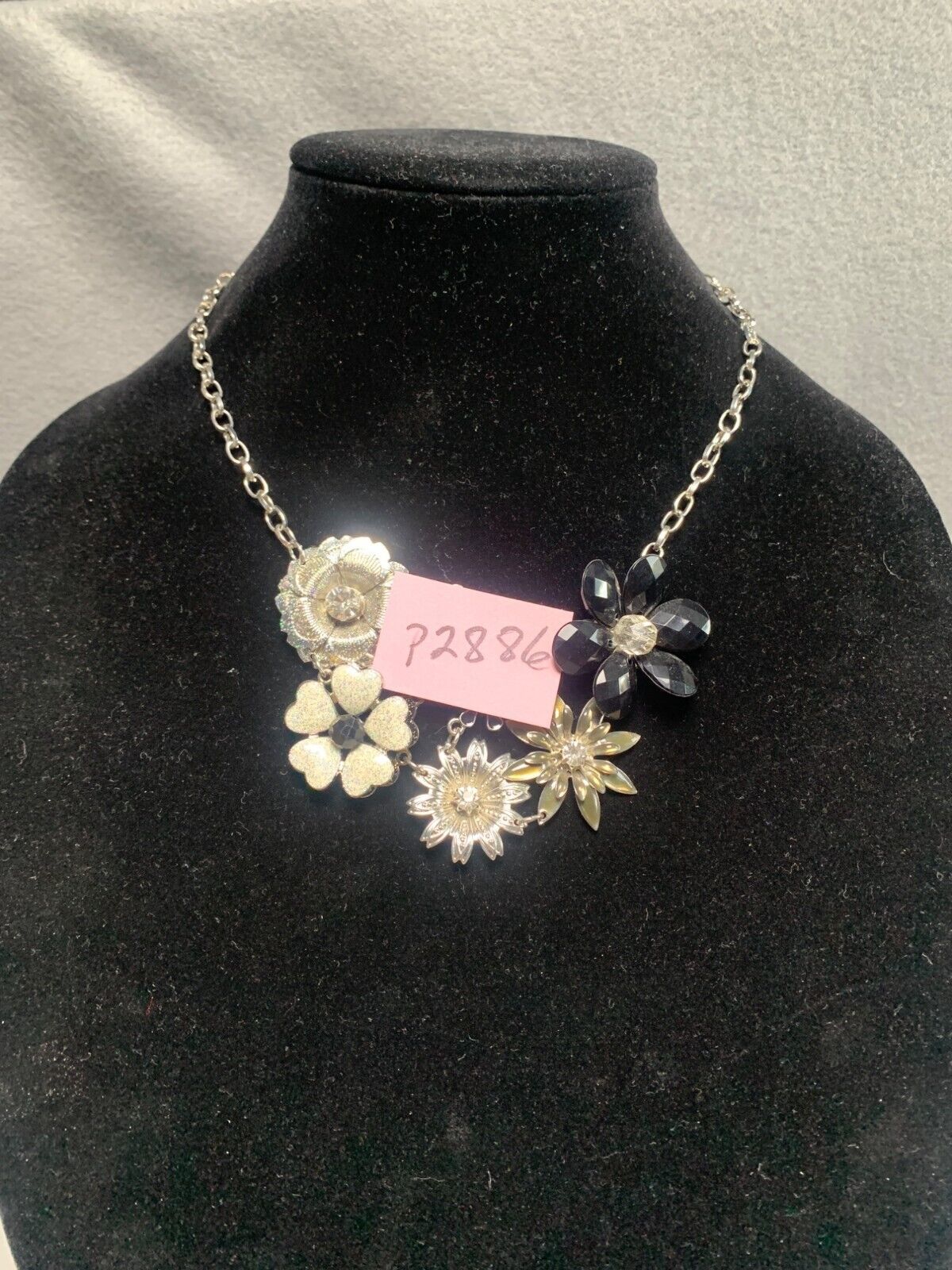 This elegant floral statement necklace features a blend of mixed metal and crystal accents, creating a versatile piece suitable for various professional settings.