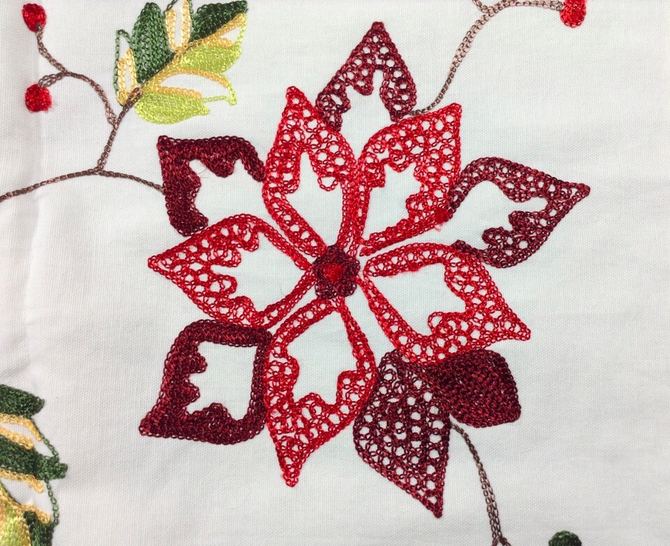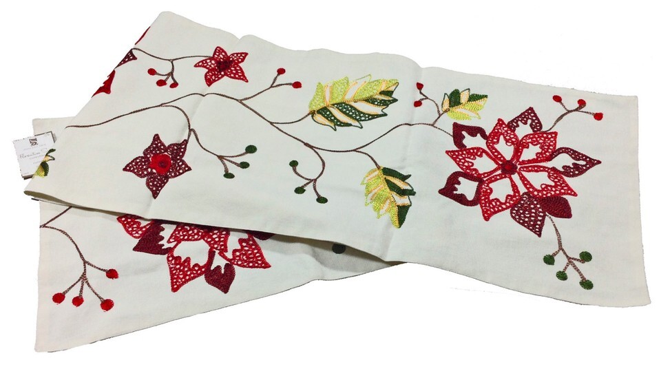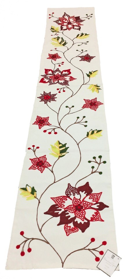 Table Runner. Florentine Spice Collection. Embroidered Red and Burgundy Flowers Design on a vanilla color cotton table runner. A beautiful contemporary look. 14x72 inches. 100% Cotton, Hand wash line dry.