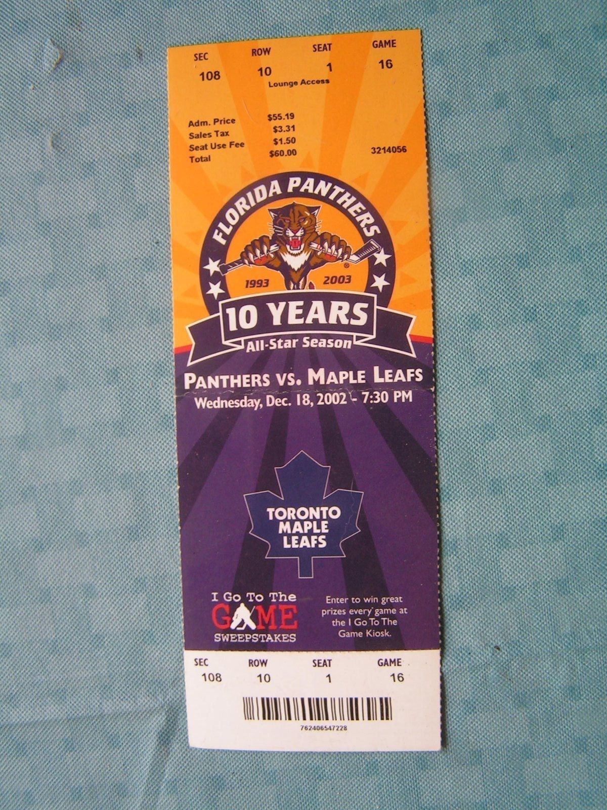 1. Full Ticket With Stub For 12/18/2002 Game Vs. Toronto