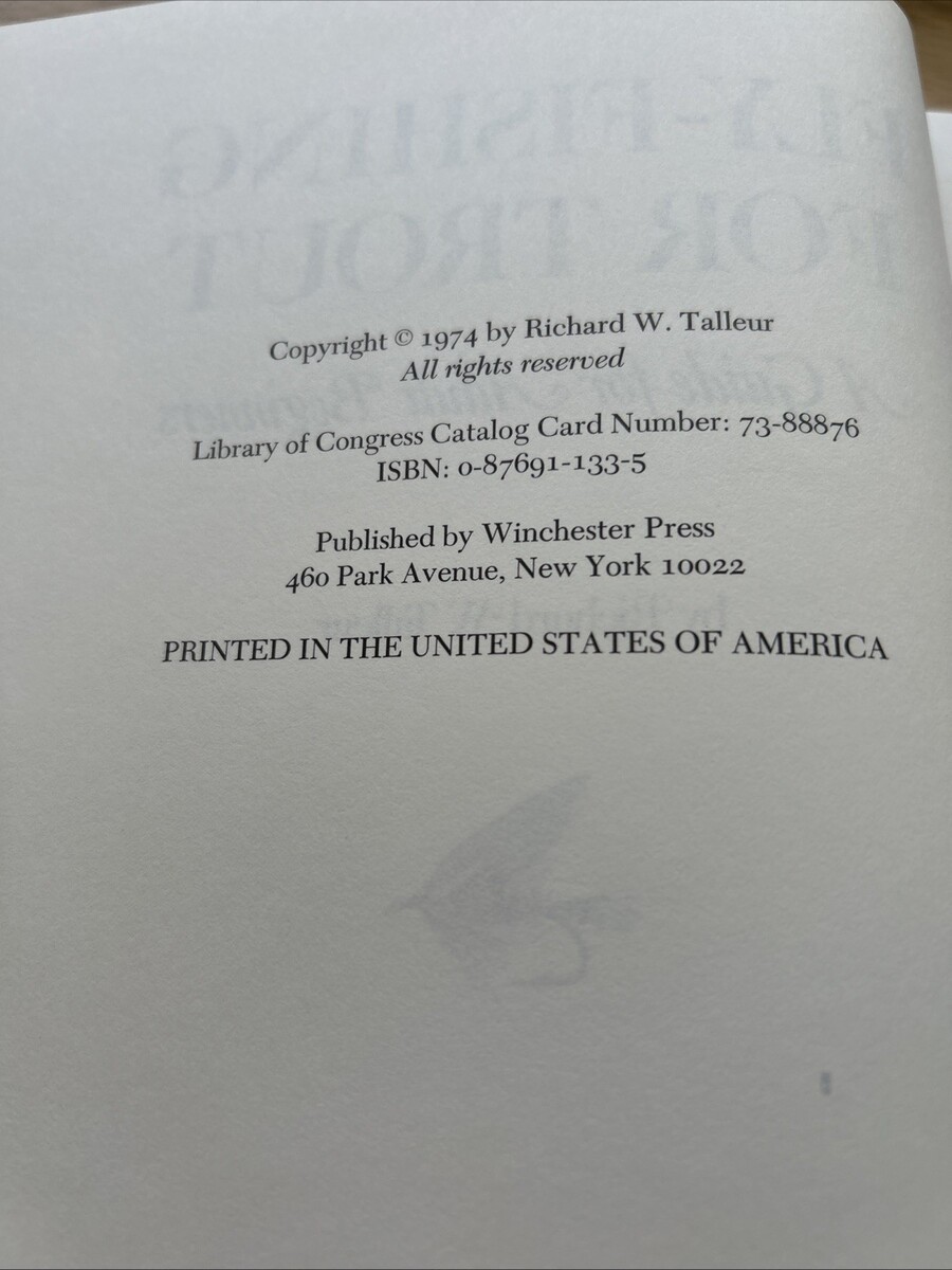 Dive into the world of fly fishing with "FLY FISHING FOR TROUT, A GUIDE FOR ADULT BEGINNERS" by RICHARD W. TALLEUR. Published in 1974 by WINCHESTER PRESS, this hardcover offers a comprehensive introduction to the sport, catering to those new to the art of catching trout. The book's content is presented in clear, fluent English, making it an accessible read for anglers of any skill level.
