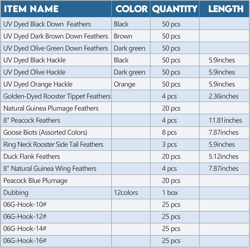 This kit includes 14 types of hand-selected feathers suitable for tying: