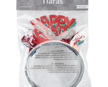 PAPER ART 4 happy birthday silver foil tiaras. Each tiara has a colored Happy Birthday phrase on top of the tiara. Colors: blue, silver, gold, and pink. each measures 4 before stretching. Fits most heads.