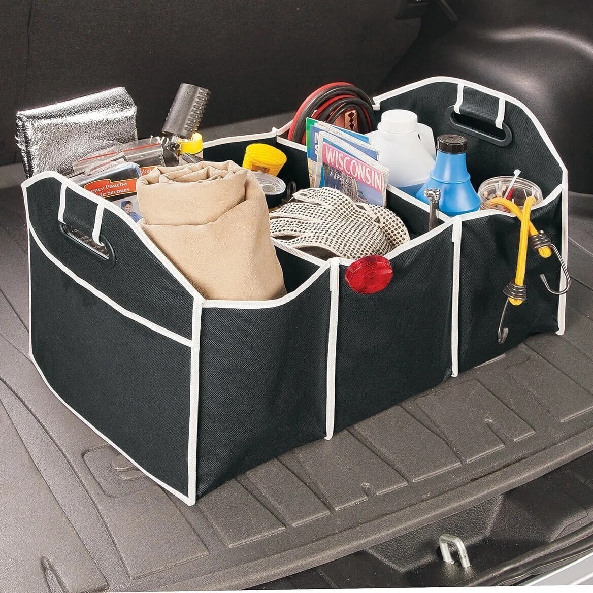 With three sections for groceries auto supplies sports gear picnic fare and more the durable car trunk organizer features two side pockets for smaller items plus side handles for easy toting.