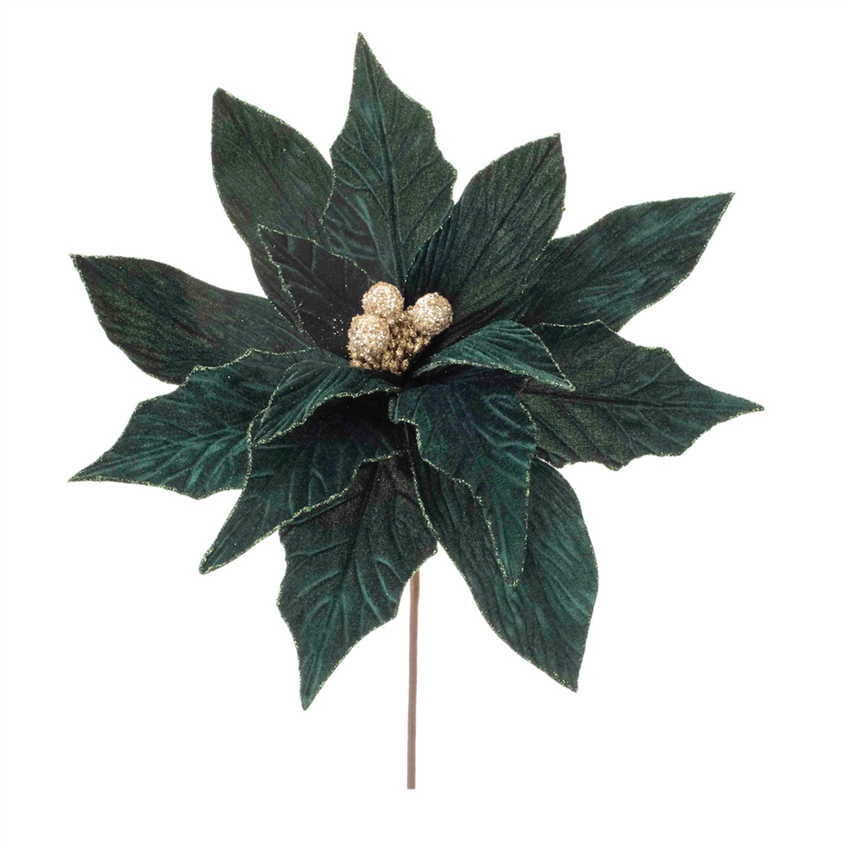 Bring the beauty of the season into your home with this exquisite set of Forest Green Poinsettia Stems. Designed with lush faux velvet petals, shimmering gold accents, and metallic berries, these stems add a touch of elegance and festive charm to any holiday arrangement. Crafted from high-quality polyester, paper, and iron wire, they offer lasting durability for years of seasonal decorating. Perfect for enhancing wreaths, garlands, or standing alone in a decorative vase, these poinsettia stems are a must-have for your Christmas decor collection. Sold in a set of two matching pieces to create a balanced display in your home.