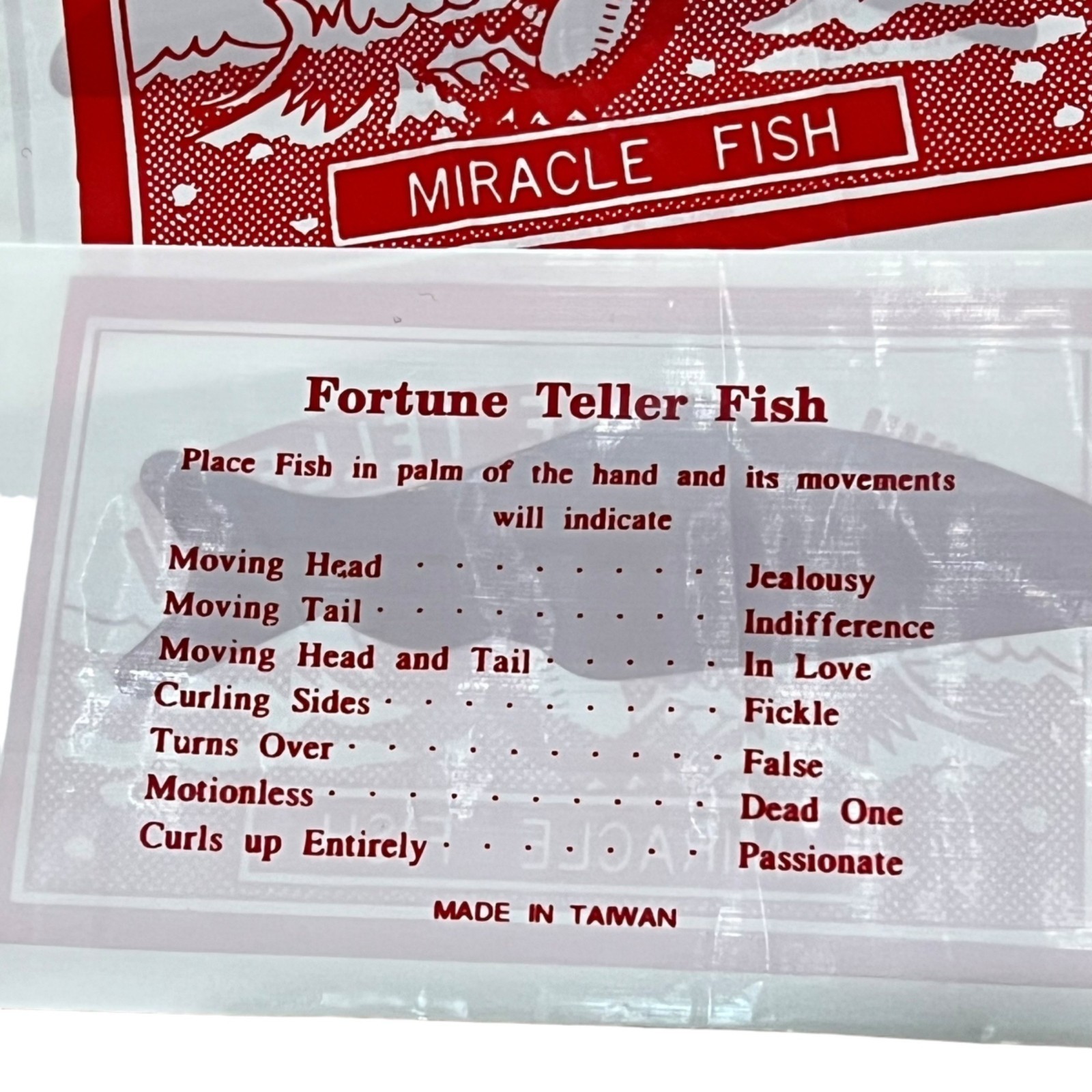 The Fortune Teller Miracle Fish is a novelty item that reacts to warmth, indicating a "fortune" based on its movements. Made in Taiwan.