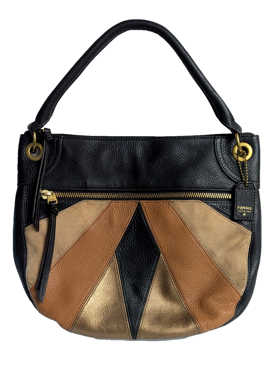 The Fossil Karli Handbag is a stylish vintage hobo bag made of leather and suede with a unique patchwork design.