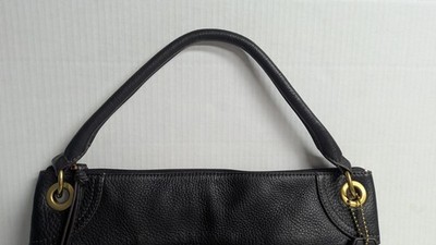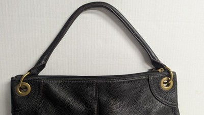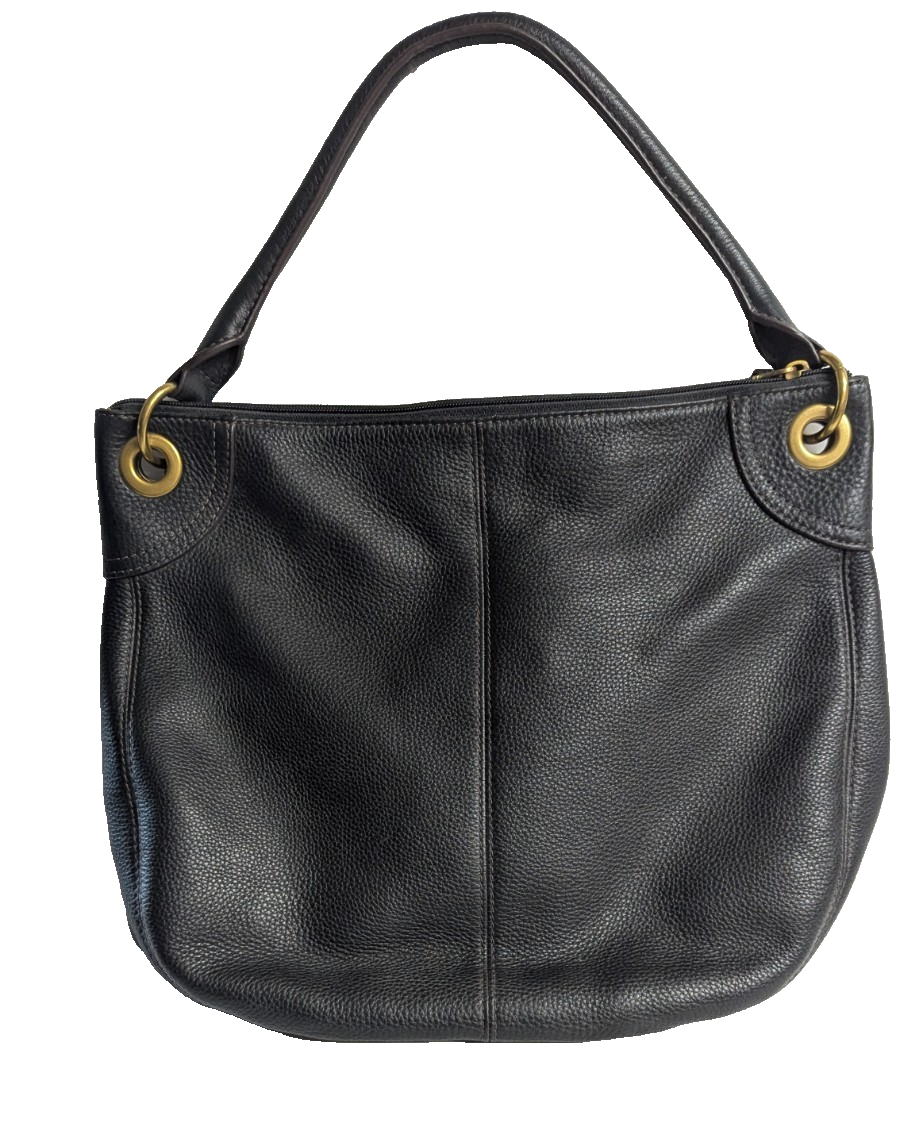 The exterior and lining are both black with pebbled finishes, and the hardware is made of brass with a gold color.