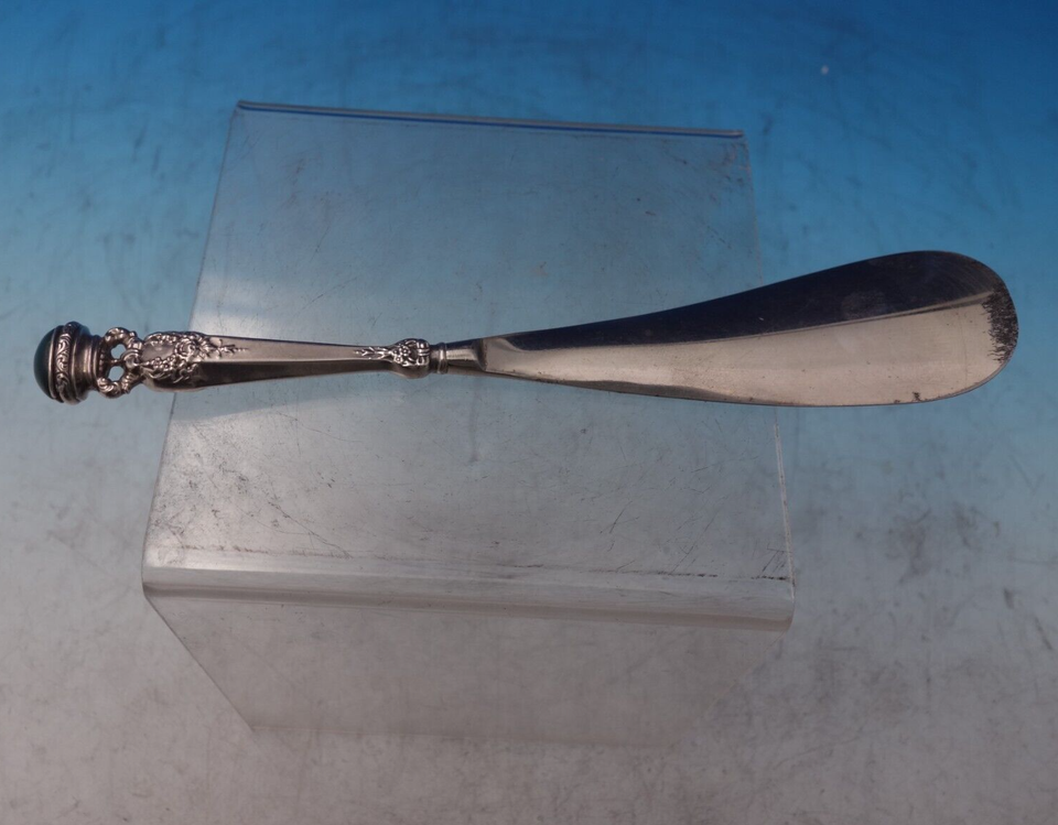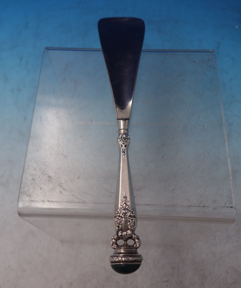 Superb Foster and Bailey shoe horn with sterling silver handle and silverplate blade featuring a dark green cabochon stone finial. This piece measures 8". It is not monogrammed and is in good estate condition as shown in the photos. Terrific!
