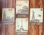 Four (4) Metal Pictures ~ NY Paris London Rome ~ Distressed Look ~ 10.25 x 13.75