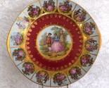 This is a beautiful piece with a Love Story pattern, figural scenes in transfer and reproduced from the work of Fragonard, a French Rococo-era artist from the late 1700's. whose work has been reproduced by in countless factories and decorating studios, This plate was produced between 1940 -1950.