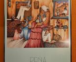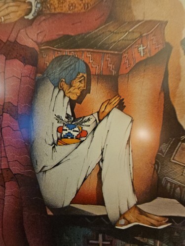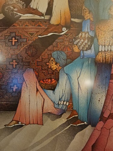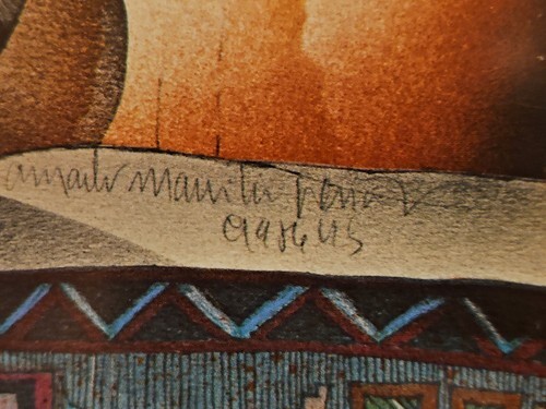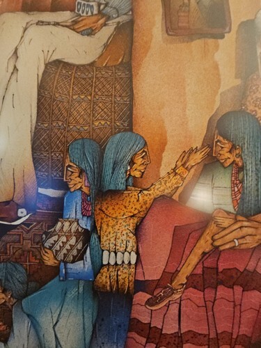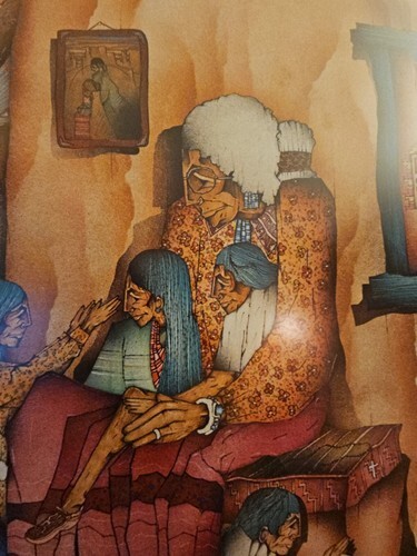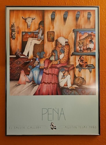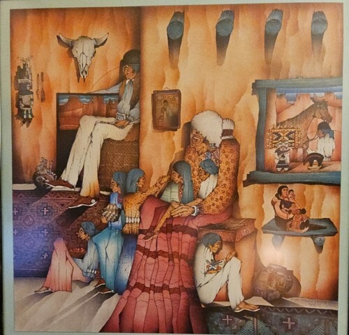 Here is a stunning 1986 art poster from the El Taller Gallery Austin, Tejas (Texas) 1986 by Amado M. Pena Jr. titled Abuelita La Cuentista - Grandmother the Storyteller. It depicts a Grandmother and all of her people of her family relaxing and listening to her stories with the art of her people - beautiful woven rugs, pottery one with paint brushes in it, pictures, a khachina, clay storyteller, the cow skull and the horse through the window or is it a painting? The colors are vibrant and the content is wonderful. This is a large, framed poster that measures about 25" x 34.5" and is ready to hang with a wire on the back. Please check out all the pictures that show the detail in this poster and the artist signature Amado Maurilio Pena Jr. (signed on original work with numbers below signature) then these posters were made were made from the original for his gallery showing at El Taller Gallery in Austin, Texas and sold.