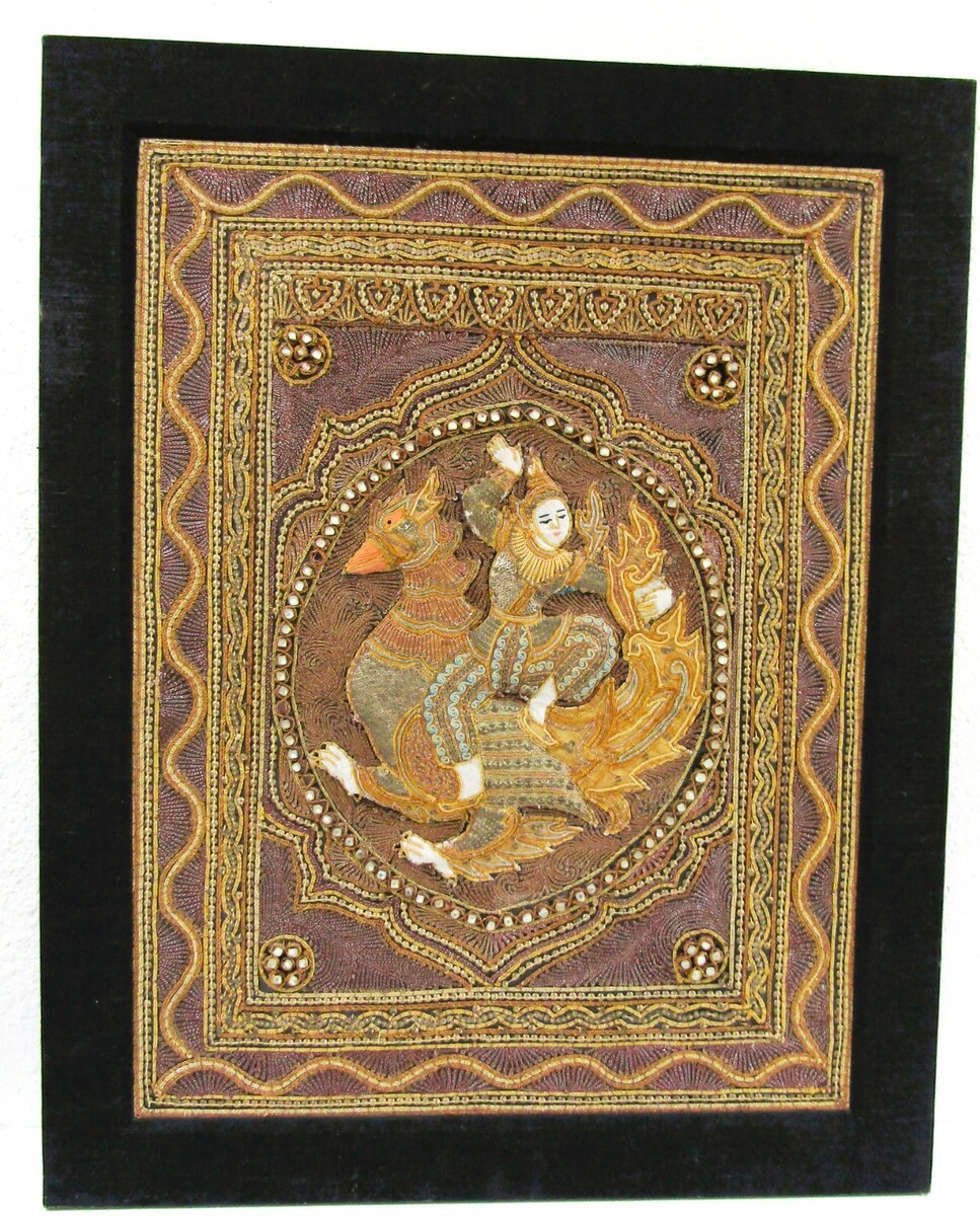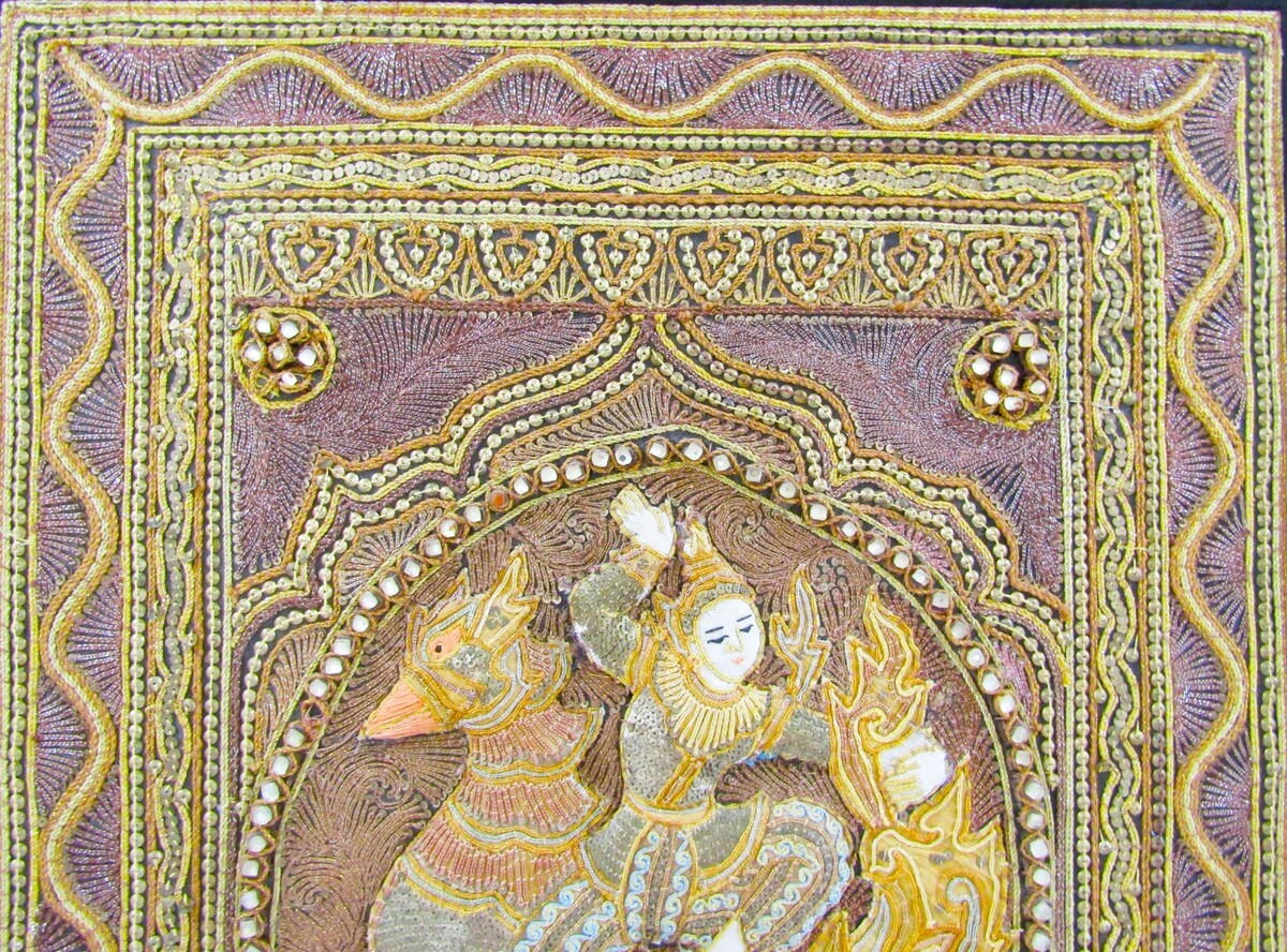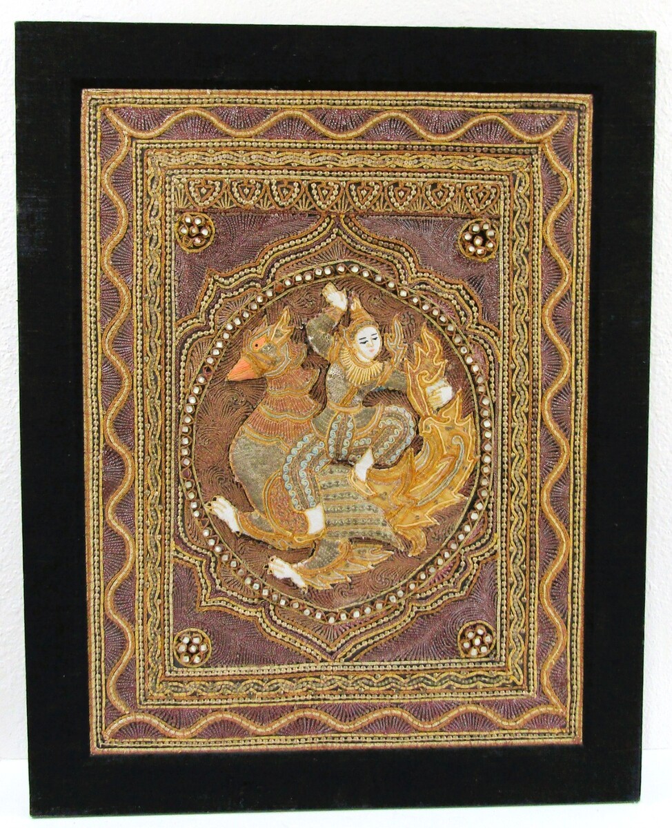 - Framed Antique Myanmar Thai Burmese Kalaga Padded Tapestry with Phoenix Bird