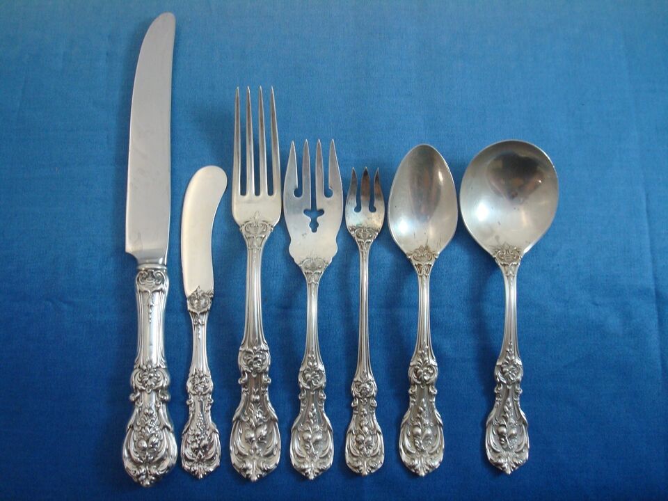 Often called America's most glorious sterling silver flatware pattern, Francis I is a true work of art. Each piece's central decoration represents a different cluster of fruit and flowers, giving your table a unique and classic presentation. This is one of the most popular silver flatware patterns of all time. This set has old hallmarks and crisp pattern detailing.