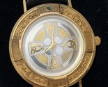 This Franklin Mint Celtic Cross Sterling Silver Vermeil (gold overlay or plating) Emerald Accent Leather Watch is a stylish and classic timepiece for men. Crafted with gold bezel and case color, this wristwatch features a quartz movement and a buckle closure. The watch has a round shape with a 39mm case size and elegant black leather band which shows use and should be replaced soon, making it a versatile piece for casual and formal wear. With its unique Celtic cross design and emerald accent, this Franklin Mint watch is a standout accessory that adds a touch of sophistication to any outfit. Comes with case as shown.