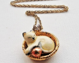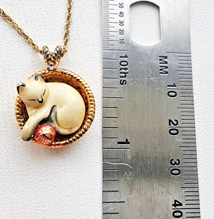 The product is a vintage Franklin Mint diamond enamel cat sterling silver 925 vermeil necklace from 1989. This pendant features a diamond as the main stone set in sterling silver with a vermeil finish. The necklace has an oval link chain and a length of 18 inches. The design is a charming cat motif that adds a touch of whimsy to any outfit. Perfect for collectors of fine jewelry or those who appreciate unique and eye-catching accessories.