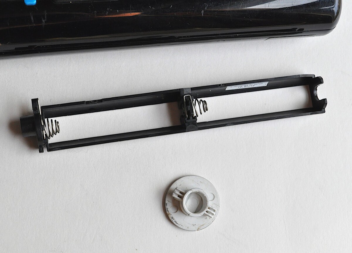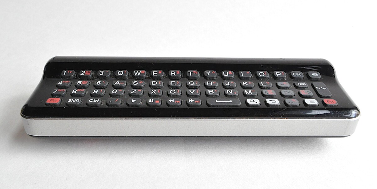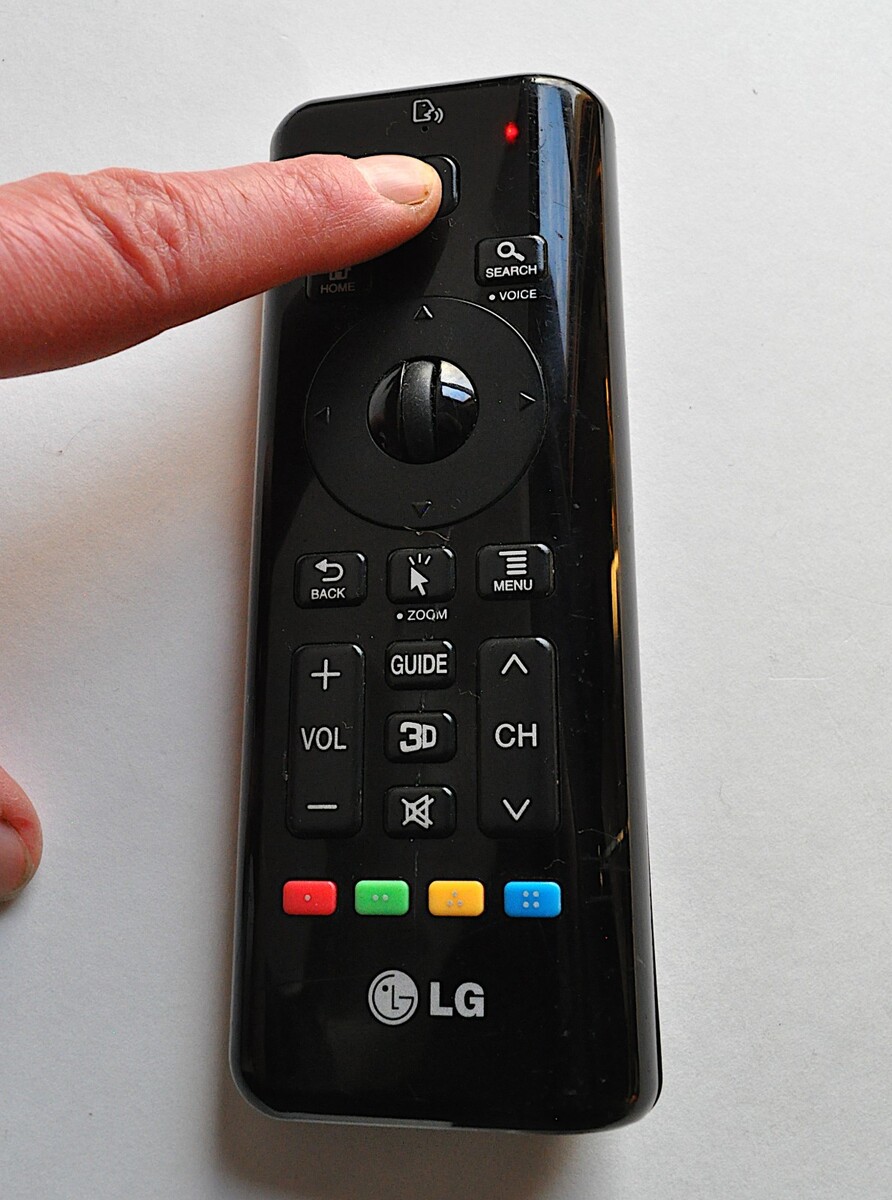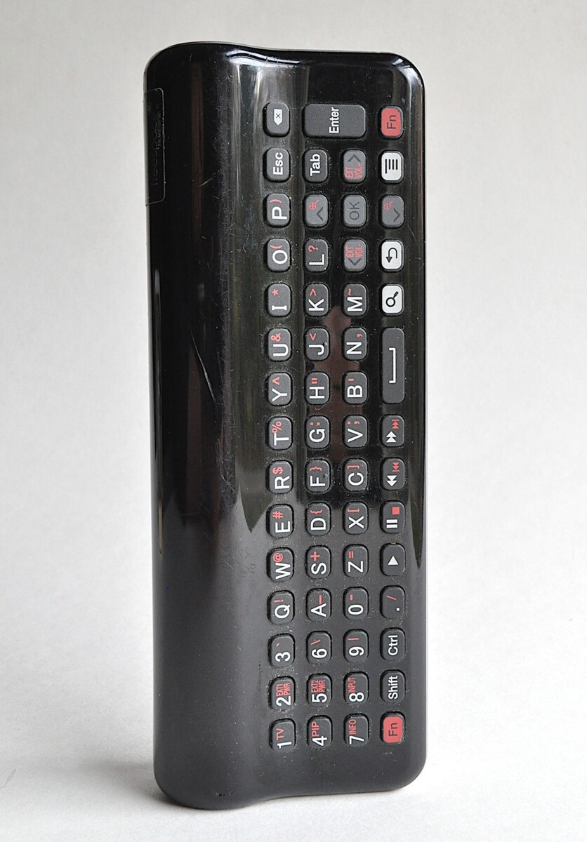 LG Freespace remote control with QWERTY keyboard. Compatible with a wide range of LG TV models; please verify compatibility with your own TV. It is not compatible with mine, so I was unable to thoroughly test it, but it does light up. Much wear, with scratches on every side, including a big one down the center front. Requires two AA batteries (not included.)