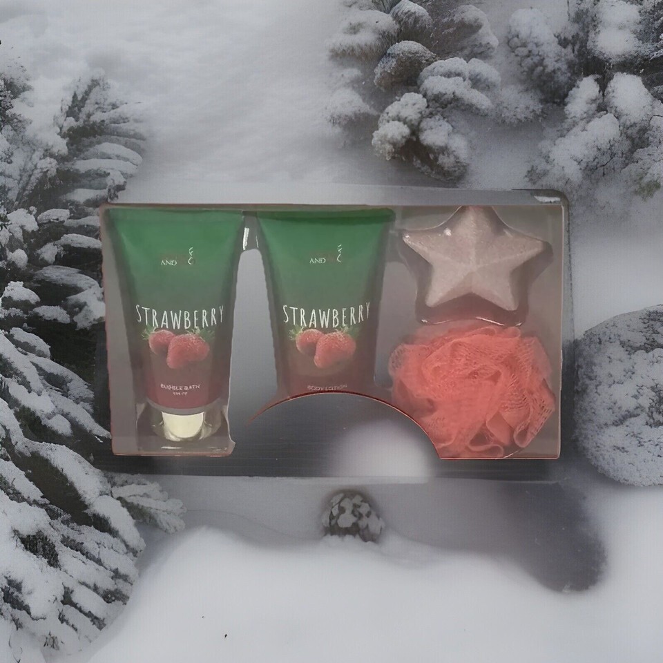 Freida And Joe 4 Piece STRAWBERRY Bubble bath/Body Lotion/ Bath Bomb Set