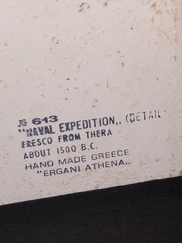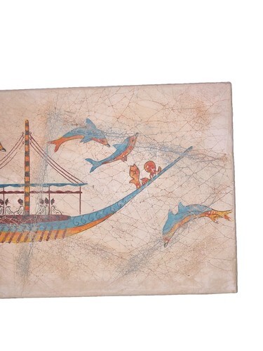 This beautiful licensed reproduction Fresco painting depicts ships and dolphins in an ancient Greek style, ?Navel? Expedition, inspired by the Thira Santorini Museum copy from around 1500 B.C. Hand-painted on a thin layer of natural plaster, this medium-sized artwork is signed by the artist and features intricate details. The wood and plaster materials used in its creation add to its authenticity, making it a unique piece of Greek culture that would be a perfect addition to any art exhibition or collection.