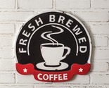 Here is a new retro design coffee wall sign. made of metal and has a nice black with red and white finish and reads Fresh Brewed Coffee, measures 16.5 inch wide by 15.25 inch high, Has keyhole hangers attached to hang, nice wall sign for a kitchen or restaurant, and check out my other decor and lighting i carry