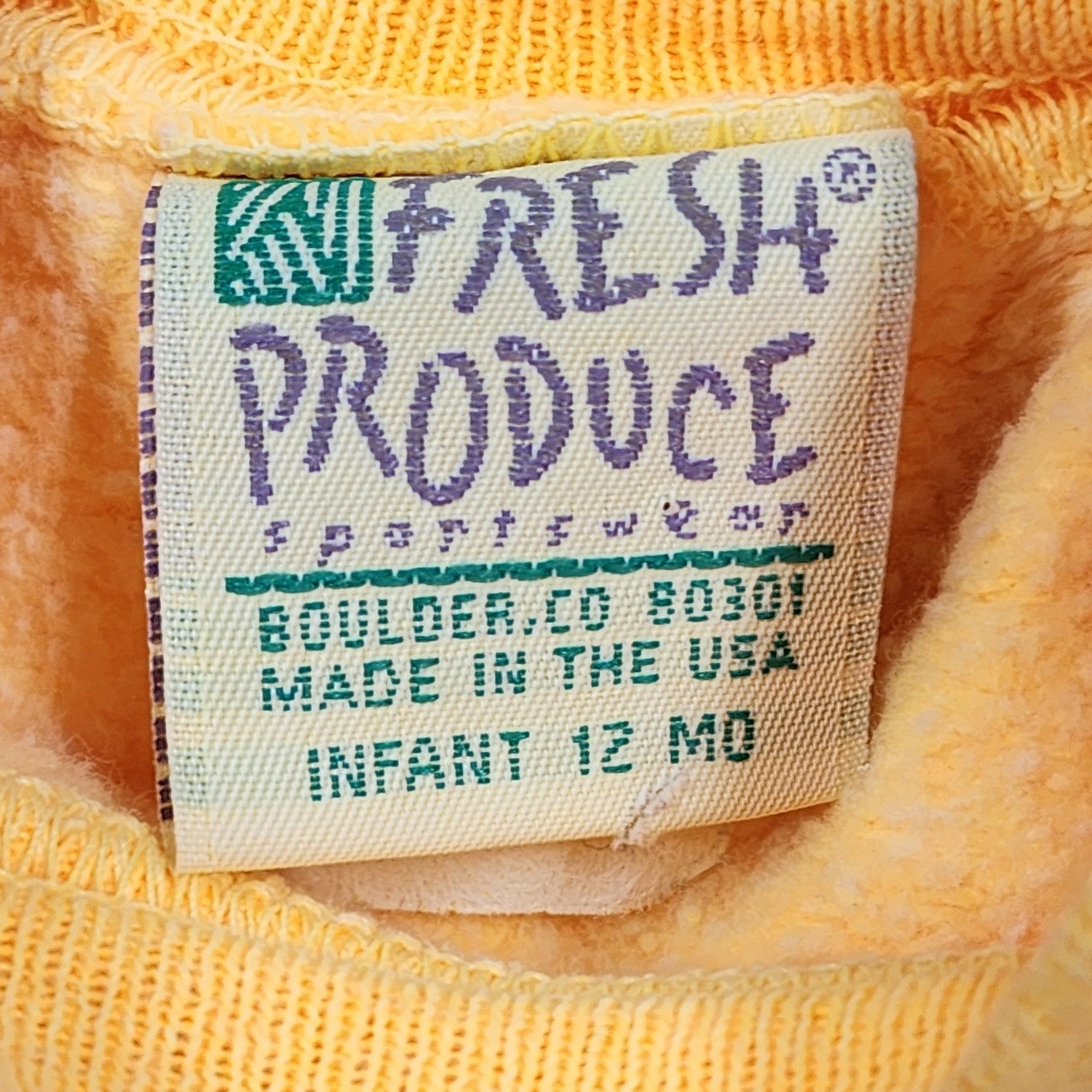 Keywords: Fresh Produce, Infant Sweatshirt, Baby Sweatshirt, Yellow Sweatshirt, Cement Truck, Embroidered, 12 Months, Vintage Baby Clothes, Retro Style, Made in USA, Cotton Sweatshirt, Toddler Sweatshirt, Kids Clothing