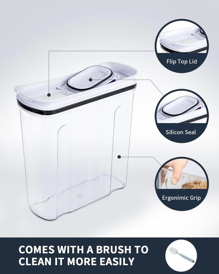 CONVENIENT DESIGN - Anti-drop, bilateral handshake We seal these cereal storage containers with silicon so they?re airtight and odorless! You'll love our comfortable ergonomic grips; Not dishwasher safe, but the package comes with a brush to make cleaning it easier