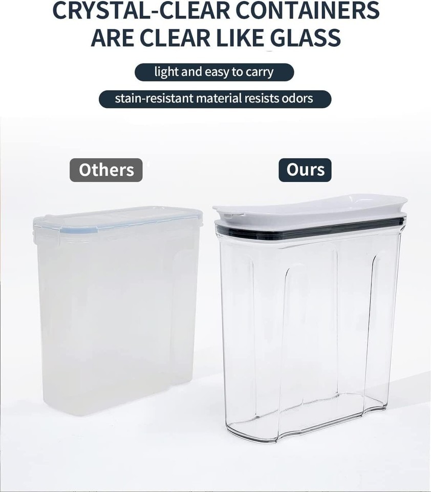 HIGH QUALITY VERSATILE - These food storage containers are made out of high-quality food grade BPA-free plastic; They are transparent so you can always know what is inside and how much is still there; The storage containers with lids are not only ideal for storing cereals but they are also great for storing flour, brown sugar, rice, grains, pasta, snacks, nuts, coffee and even pet food