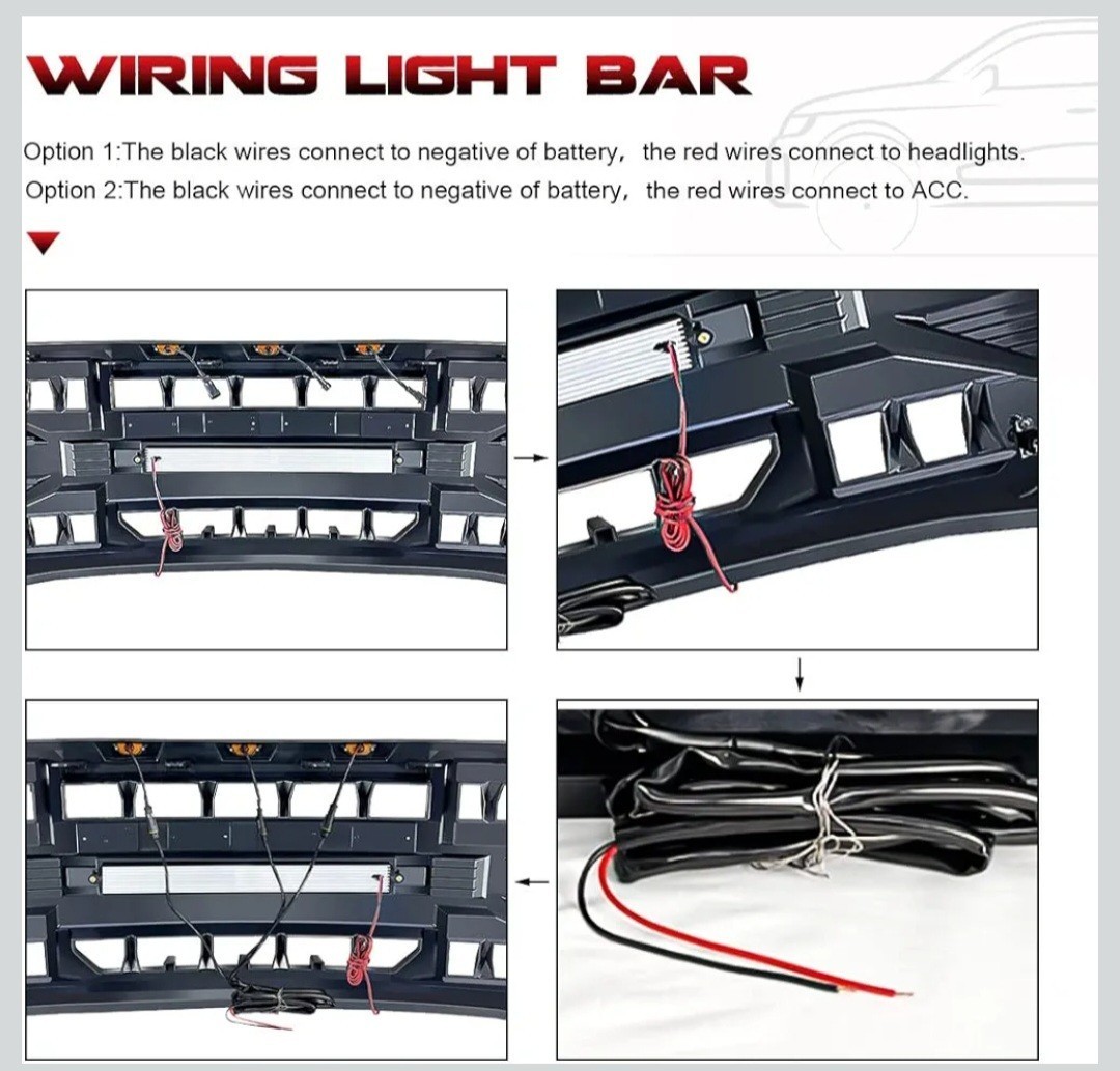 Package Content: A matte black grill, wiring harness, bolts, and screws; The grill can be painted with any color that you need
