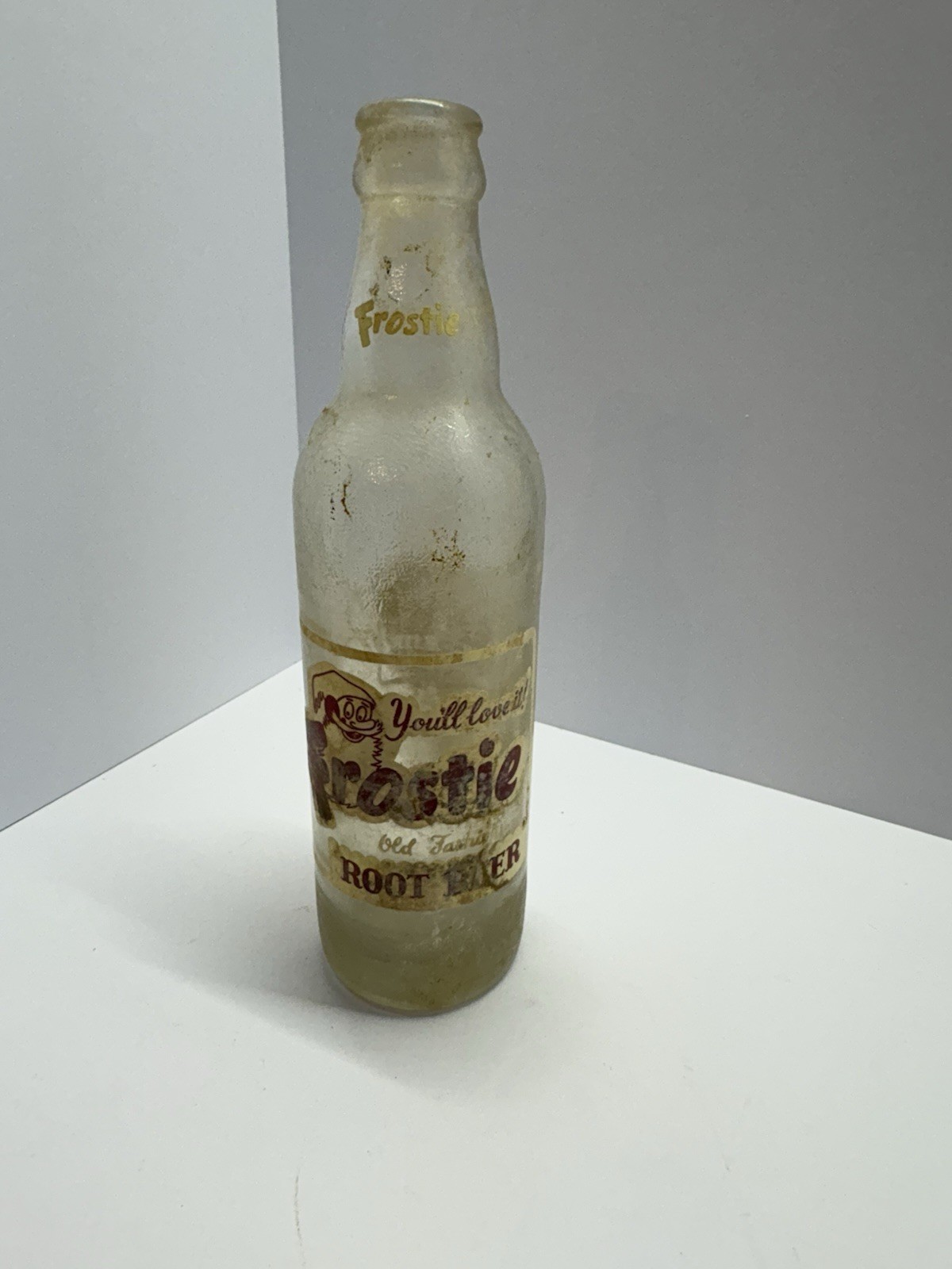This Frostie Root Beer bottle dates from approximately the 1950s-1960s, when the Frostie Beverage Company was at its peak popularity in the United States. The clear glass bottle with its distinctive logo and labeling was a common sight in American refrigerators and soda fountains during this era.