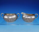 Pretty Fuchs and Beiderhase sterling silver sugar and creamer 2-piece set. The pieces are hand chased with repoussed scrollwork. They are marked #802 and dated 1890, and were retailed by Gorham. The set includes: