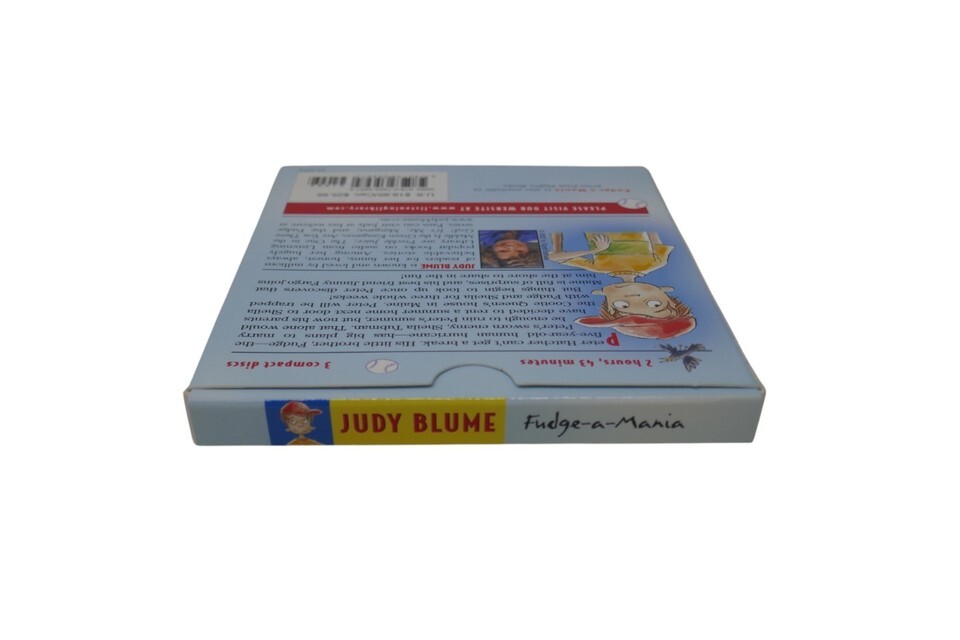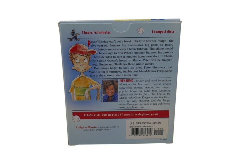 "Fudge-A-Mania" by Judy Blume is a humorous and engaging audiobook in the compact disc format. The story revolves around themes of family, siblings, and social issues, making it a relatable and entertaining option for young listeners. The discs have some scuffs or scratches, which do not effect playability.