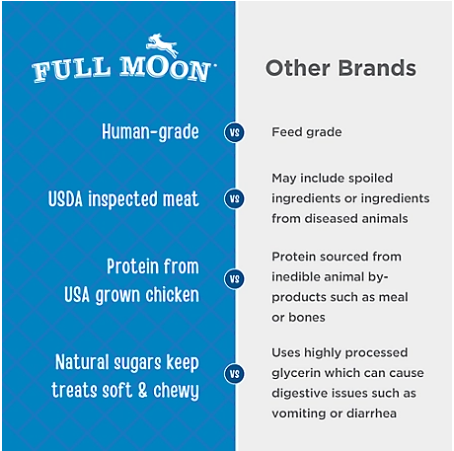 Full Moon treats are proudly made in the United States using regionally sourced ingredients, including USDA approved, antibiotic-free chicken