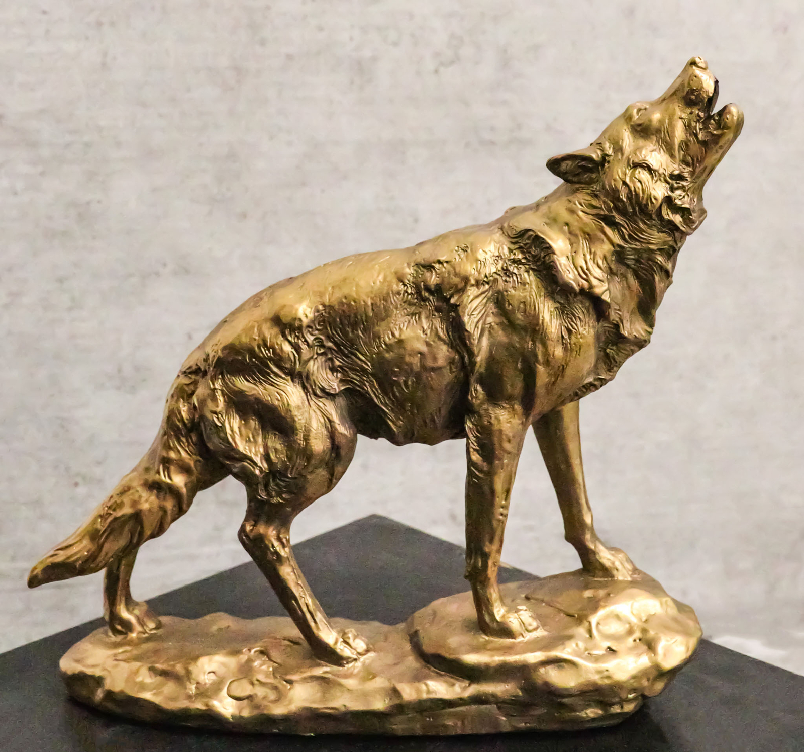? This Howling Gray Wolf Statue is made of designer resin that is intricately sculpted with attention to detail. It is then hand painted and polished individually in gold patina finish.