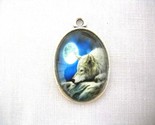 SILVER ALLOY BASE METAL WITH GLASS CABOCHON WITH A PICTURE OF AN ALASKAN SPIRIT WHITE WOLF RESTING ON A BOULDER WITH A FULL MOON IN THE SKY OVAL SHAPED PENDANT ON ADJUSTABLE CORD NECKLACE