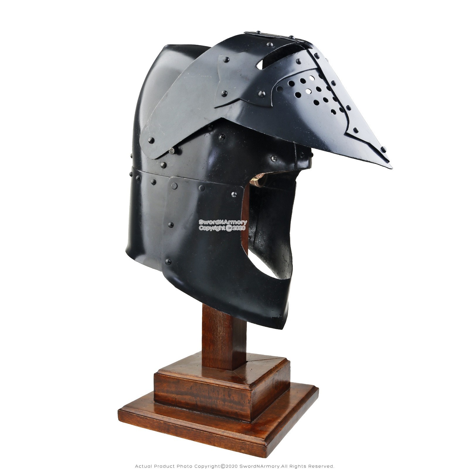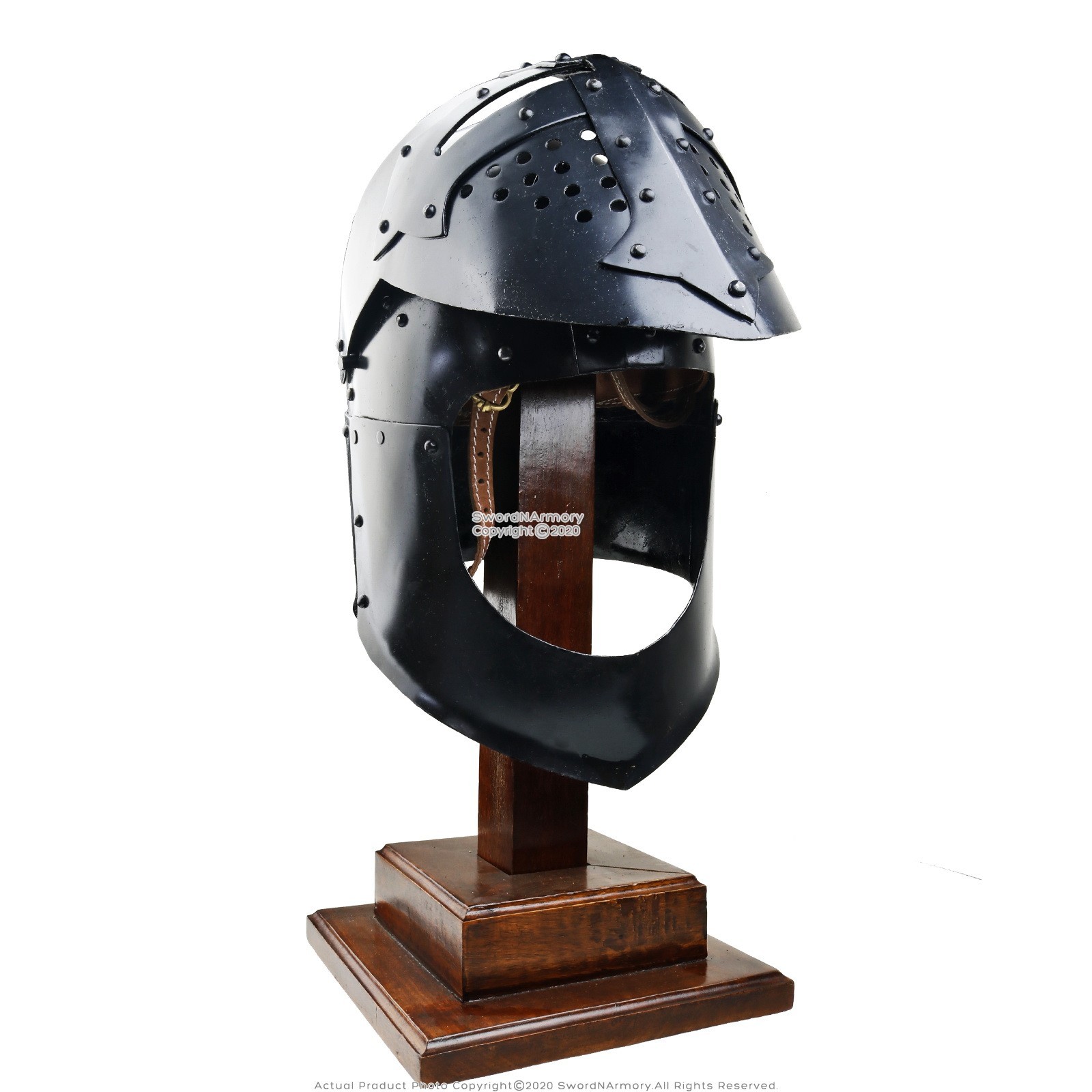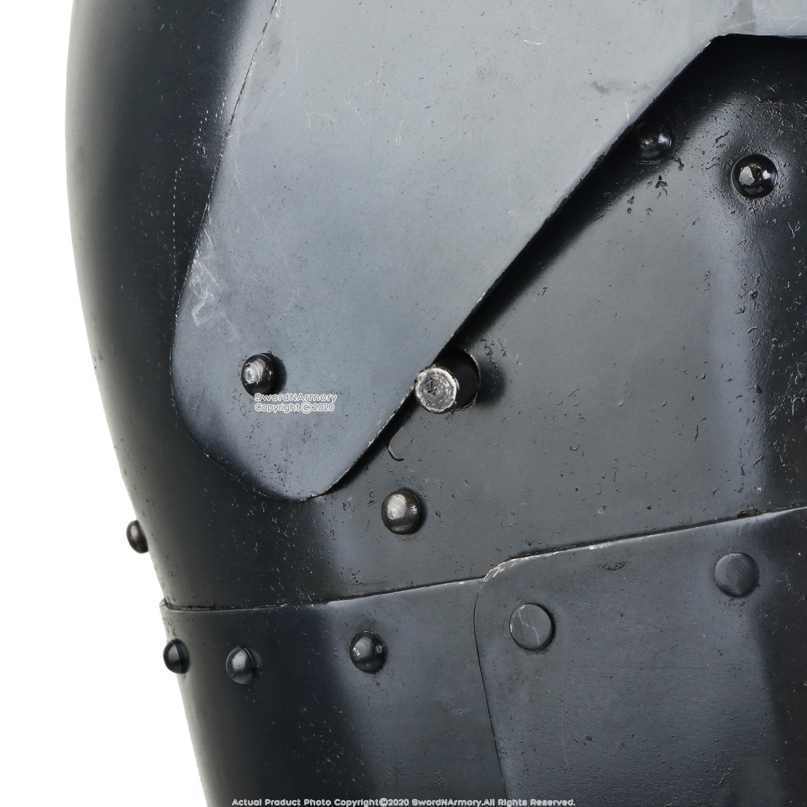 Armor up, and prepare to fight for king and country with this intimidating visored bassinet helmet. This beautiful piece is inspired by early 14th century bassinets, which had been given visors to protect the face, a feature absent from earlier bassinets, but before the visors began to be drawn out into a beak or muzzle shape, common called a ?pig-face.? The study 16 gauge steel on this helmet will serve well as protection during SCA armored fighting. The eye slits and air vents provide both good visibility and airflow.