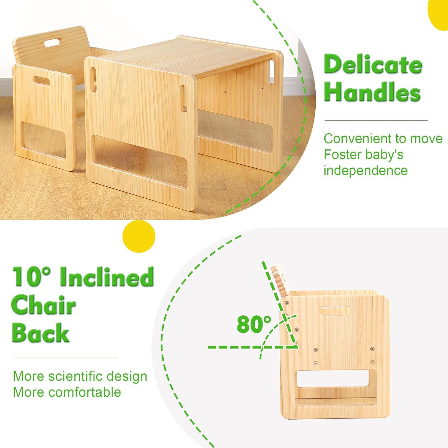 ?Montessori Table Chair Set, Explore the World Foster Independence?FUNLIO Montessori table and chair set is suitable for toddlers aged 1-3 years. Made of high-quality natural pine wood superb craftsmanship, it is super healthy for young learners to explore and create with confidence. Little kids can freely learn, read, eat, and play on this table set. This enchanting set will be the perfect setting for little minds to blossom and discover the joy of independent learning. ?2-Level Height Adjustable, Grow with Your Child?Both the table and chair are 2-level height adjustable. For the table, the taller height is 13.6in/34.5cm, and the lower height is 9.6in/24.5cm. When children grow up, they can use the table as a stool. For the chair, the taller height is 6.5in/16.5cm, and the lower height is 5.3in/13.5cm. As your baby grows up, he/she can always find suitable usage with this set. And all the beautiful memories will be memorized. ?High-quality Pine Wood Superb Craftsmanship?Made of high-quality pine wood, this toddler table chair set is healthy for children to touch. The water-based coat, with great craftsmanship, makes the surface smooth to the touch, without any burrs. It is also easy to clean. Parents or teachers can feel relieved to let little talents display. The natural color with wood grain also adds a touch of natural beauty to any classroom or playroom. ?Easy to Move Around, Comfortable Chair Back Design?Look at the handles on the table and chair. They are deliberately designed for kids to easily carry them around. It will be a wonderful way to unleash their freedom to explore the world. Different from other straight chair backs, our chair back is inclined to a scientific angle of 10. When a child sits on it, he/she will feel very comfortable. ?90 Days Return Policy 1 Year Quality Services?FUNLIO is committed to providing our customers with exceptional products services. We offer a 90-day return policy and a 1-year quality service. In case any parts are missing or damaged during transportation, please contact us immediately. We will assist you by sending replacement parts or exchanging the product in 2 business days. Either way, you will also get a 10% return.