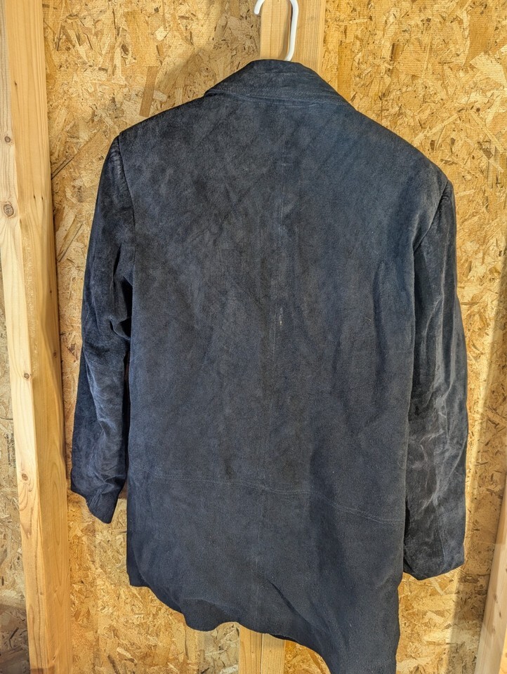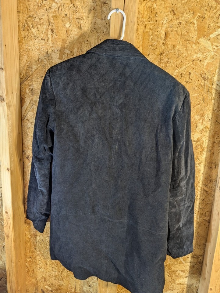 This is a G-III brand women's leather coat in size M. It is a mid-length black coat with long sleeves and a solid pattern. The outer shell material is leather, and the lining material is nylon. It has a softshell fabric type and features a button closure. The coat is designed as an overcoat with a lined interior and pockets for storage.