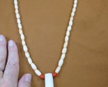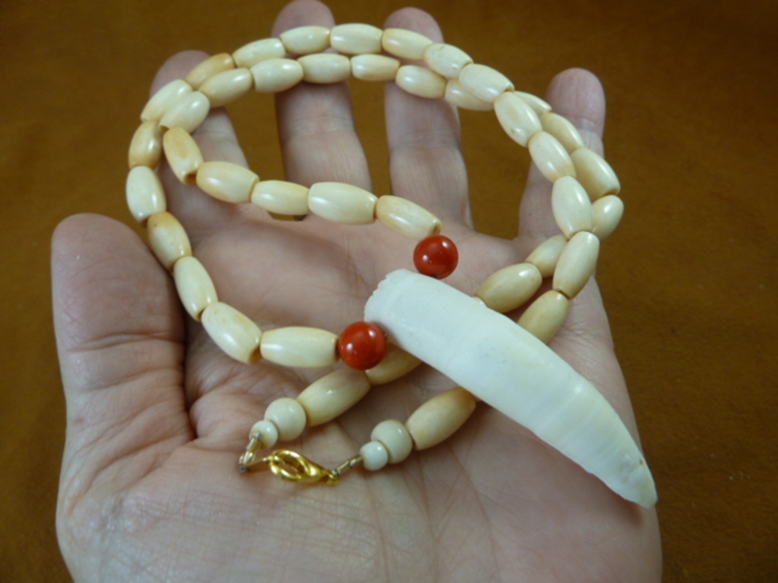 (internal item #G160-306) This is a 23" long gator tooth necklace with a Single 2-1/4" gator tooth and 13x7 mm off white water buffalo ache beads; 8 mm red mother of pearl round accent beads,14k gold lobster claw and tab closure.