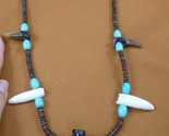 You are bidding on a 22" long necklace made with Two 1-3/8" gator claws, one 1-1/2" claw; two 1-1/2" gator teeth 5x2 mm brown water buffalo ache beads; 14x10 mm round barrel shaped blue turquoise beads,14k gold plated lobster claw tab closure.
