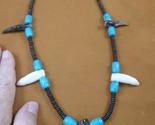 You are bidding on a 22" long necklace made with Two 1-1/2" gator claws, one 1-3/4" claw; two 1-3/8" gator teeth and 5x2 mm brown water buffalo ache beads; 14x10 mm round barrel shaped blue turquoise beads, 14k gold plated lobster claw tab closure.