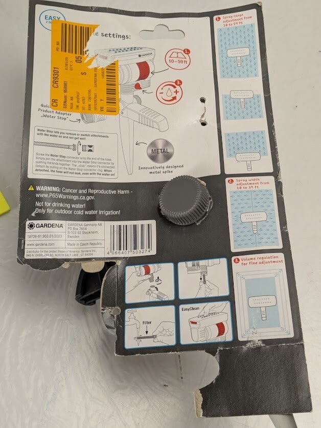 Items delivered: 1x GARDENA ZoomMaxx Oscillating Sprinkler, 96 sq ft min to 2300 sq ft max area coverage, 10 ft - 60 ft range of spray, 40 ft width spray max and 1x GARDENA quick connect fitting