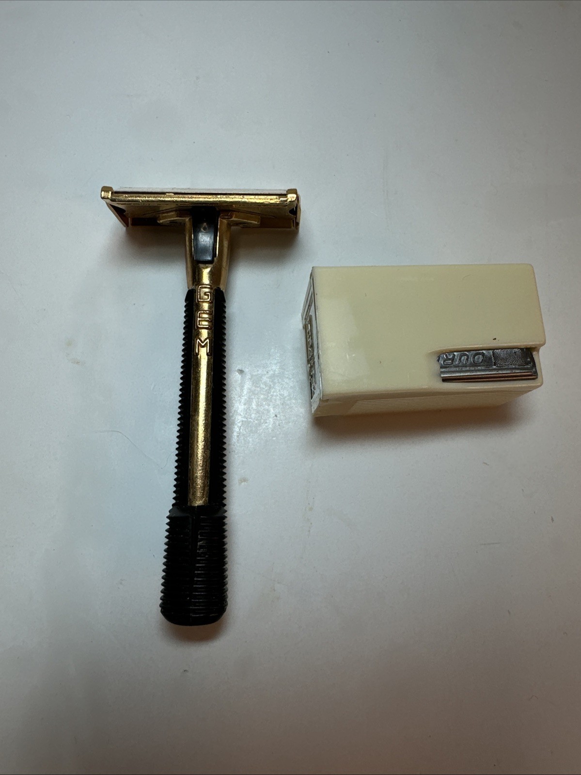 - GEM 1960s gold brass Single Edge Safety Razor Vintage w/ Box & Blades