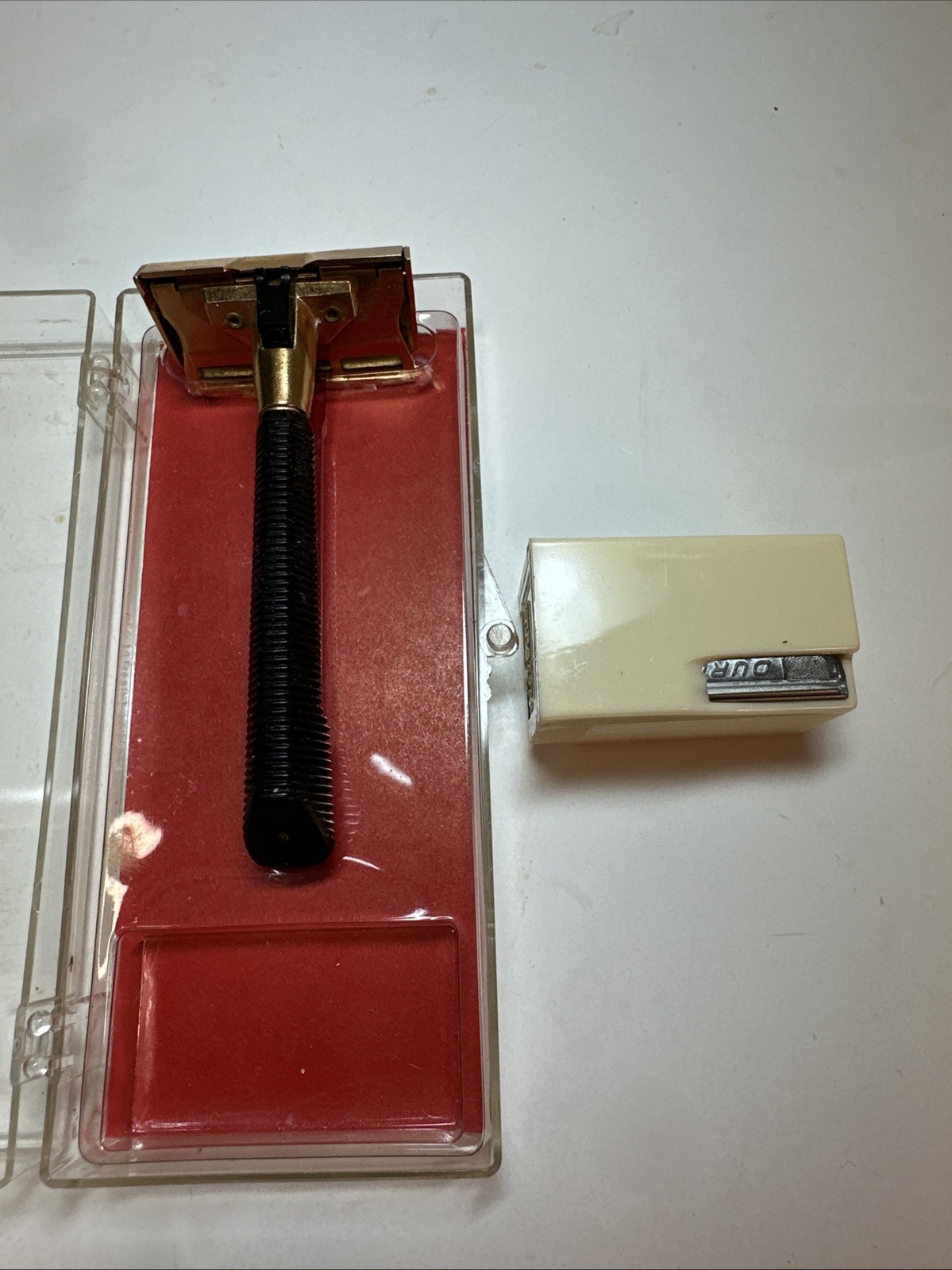GEM 1960s gold brass Single Edge Safety Razor Vintage w/ Box & Blades