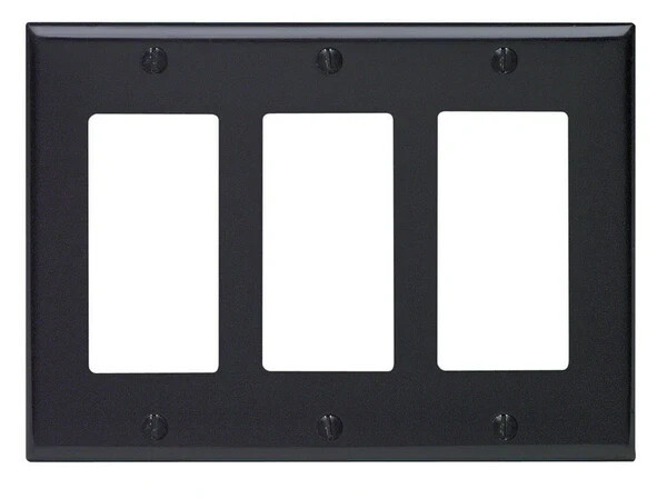 This wall plate is used by electricians, contractors, and homeowners to finish 3-gang electrical boxes containing GFCI outlets, rocker switches, or mixed device configurations in residential settings. It is commonly installed in kitchens, bathrooms, laundry rooms, garages, and outdoor areas where GFCI protection is required by code. The thermoset construction ensures long-term stability in high-moisture or high-heat environments, while the black finish provides a clean, modern contrast against light-colored walls or coordinates with dark fixtures. Its compatibility with industry-standard Decora devices guarantees a professional, flush fit without gaps or misalignment. As part of a coordinated electrical system, this plate delivers safety, durability, and refined aesthetics for everyday use.
