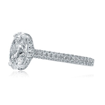 La piedra central con forma ovalada de 2.23 quilates de GIA se refiere a la forma de la piedra principal en el anillo. En lugar de ser redondo, es una forma alargada que es mas ancha en una direccion que la otra. El diamante brilla con increíbles fuego y brillantez, y los diamantes de corte brillante redondos crean un aspecto favorecedor y elegante en el dedo. Hecho en oro blanco de 18 quilates. El peso total de quilates es de 3.33 quilates.