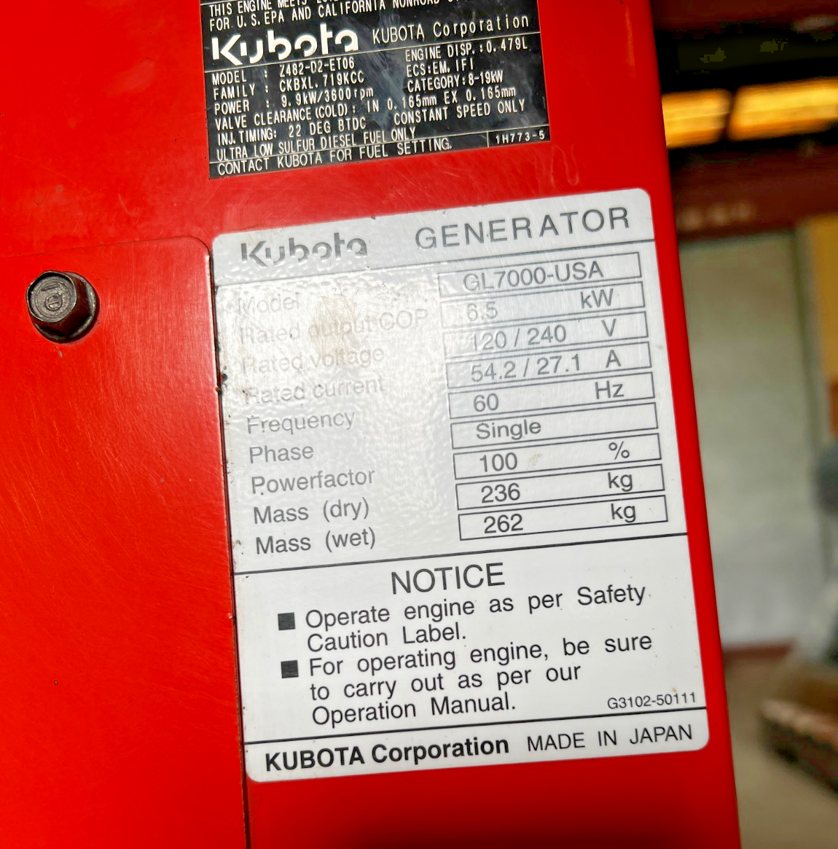 - GL7000 Kubota generator set w/ KUBOTA engine Z482-D2-ET06 id: 941