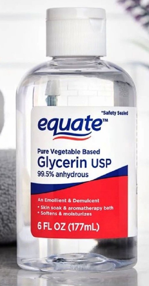 FOR SALE IS ONE (1) NEW BOTTLE OF LIQUID GLYCERIN 99.5% USP 6 fluid ounce BOTTLE SAFETY SEALED AND MADE BY EQUATE BRAND MPN 08239 UPC# 681131082396. EQUATE BRAND 99.5% GLYCERIN USP IS AN EMOLLIENT AND DEMULCENT (relieves inflamation or irritation), PURE, NATURAL AND VEGETABLE BASED, ALWAYS FACTORY FRESH AND FACTORY SEALED, MADE FOR EQUATE IN THE USA BY HUMCO. GLYCERIN, ALSO KNOWN AS GLYCERINE, ALSO KNOWN AS GLYCEROL, IS A TRADITIONAL HEALTHCARE PRODUCT USED AS A SKIN PROTECTANT, USED TO HELP PREVENT AND TEMPORARILY PROTECT WIND BURNED SKIN AND LIPS, SOFTEN SKIN AND LIPS. GLYCERIN MAY ALSO BE USED FOR CHAFED, CRACKED OR CHAPPED LIPS AND SKIN, USED AS A SKIN SOAK AND AROMATHERAPY BATH. USE GLYCERIN OIL BY ITSELF OR ADD IT TO A CREAM OR LOTION. THIS GLYCERIN IS OFTEN USED IN CERTAIN ORAL PHARMACEUTICALS FOR SWEETENING AND PRESERVATIVE PROPERTIES. 6 fluid ounce SAFETY SEALED FLIP CAP BOTTLE IS MANUFACTURED AND PACKAGED IN THE USA. YOU WILL RECEIVE ONE (1) 6 fluid ounce BOTTLE OF GLYCERIN 99.5% USP BY EQUATE BRAND SHIPPED BY USPS FIRST CLASS MAIL.....