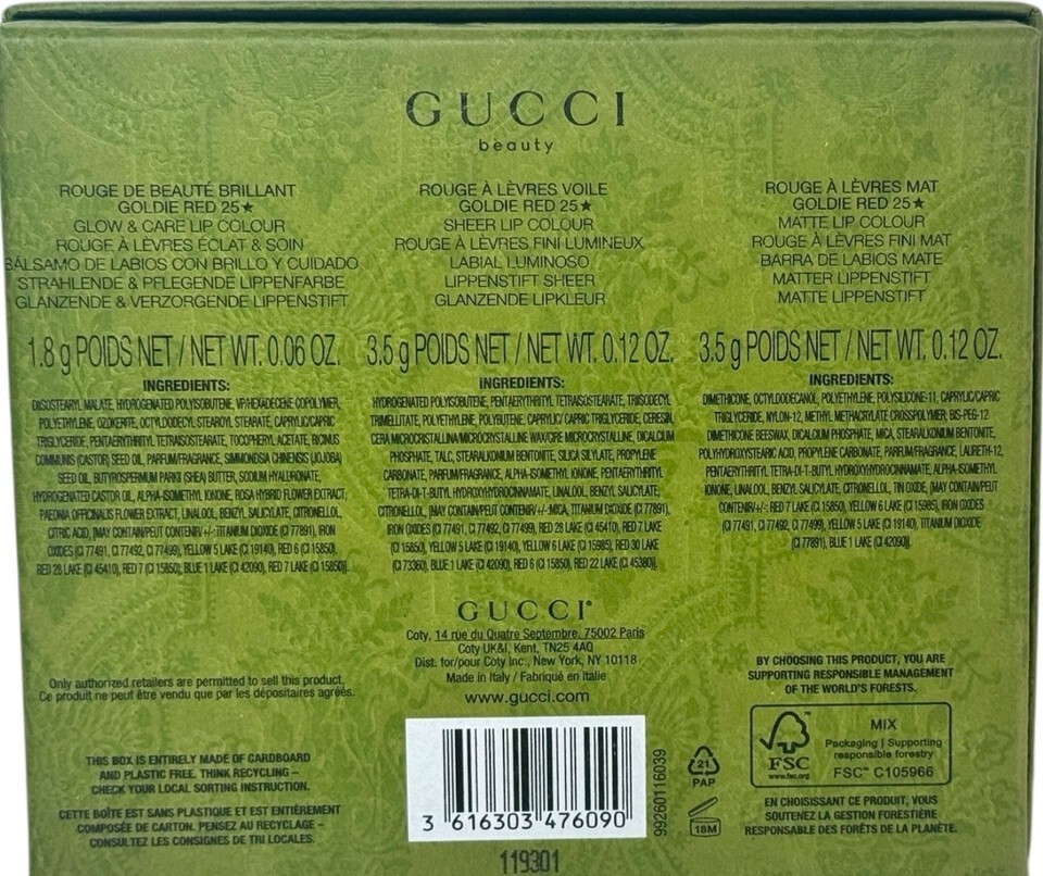 GUCCI Lipstick Trio Set Rouge de Beauté, Lévres Voile & Mat Matte GOLDIE RED 25